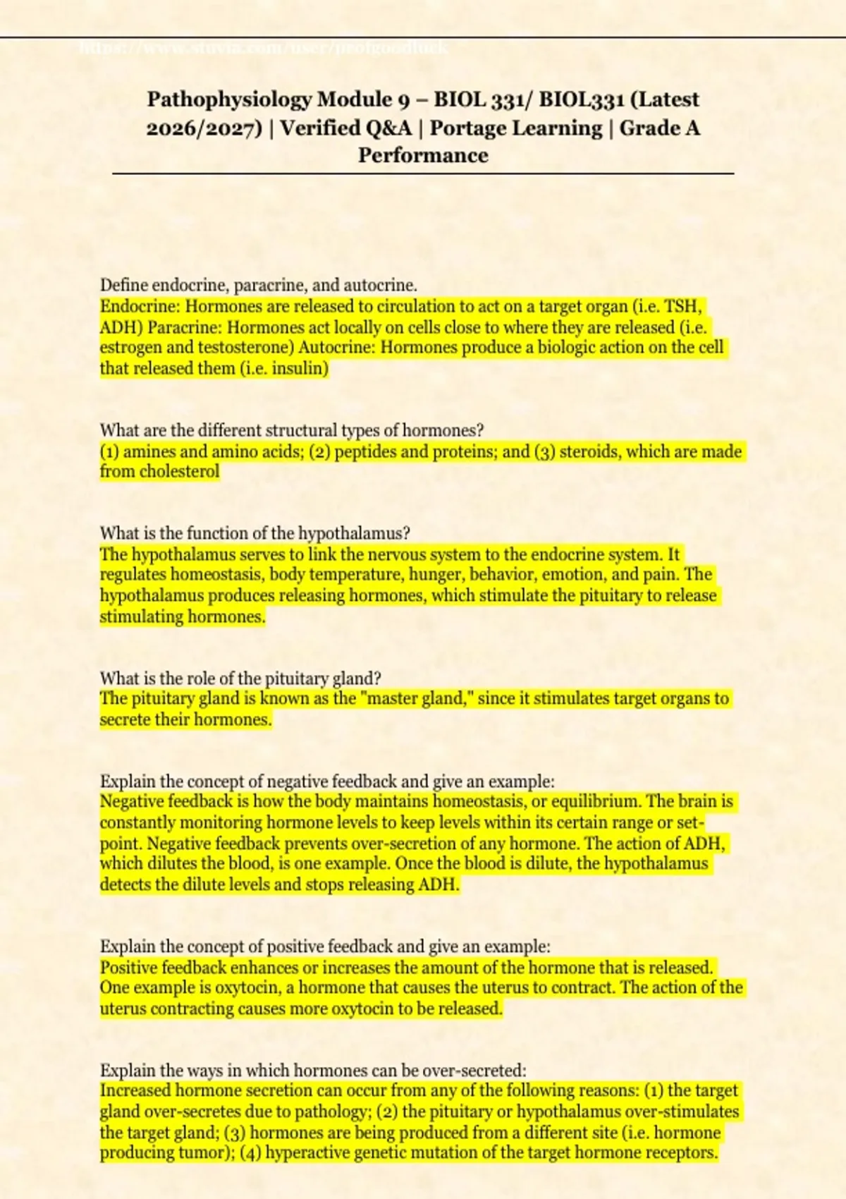 Pathophysiology Module 9 – BIOL 331/ BIOL331 (Latest 2026/2027) | Verified Q&A | Portage Learning | Grade A Performance