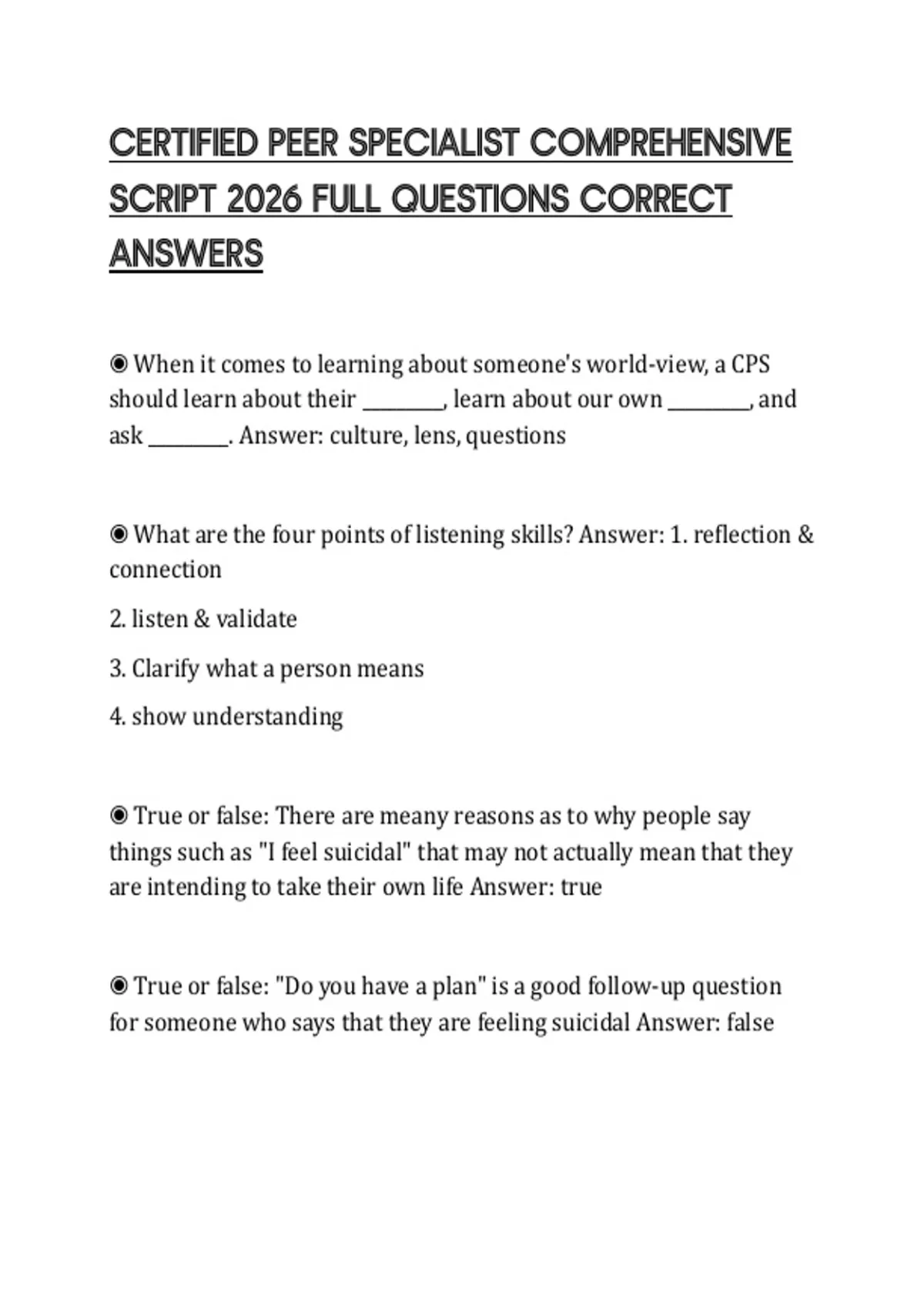 CERTIFIED PEER SPECIALIST COMPREHENSIVE SCRIPT 2026 FULL QUESTIONS CORRECT ANSWERS