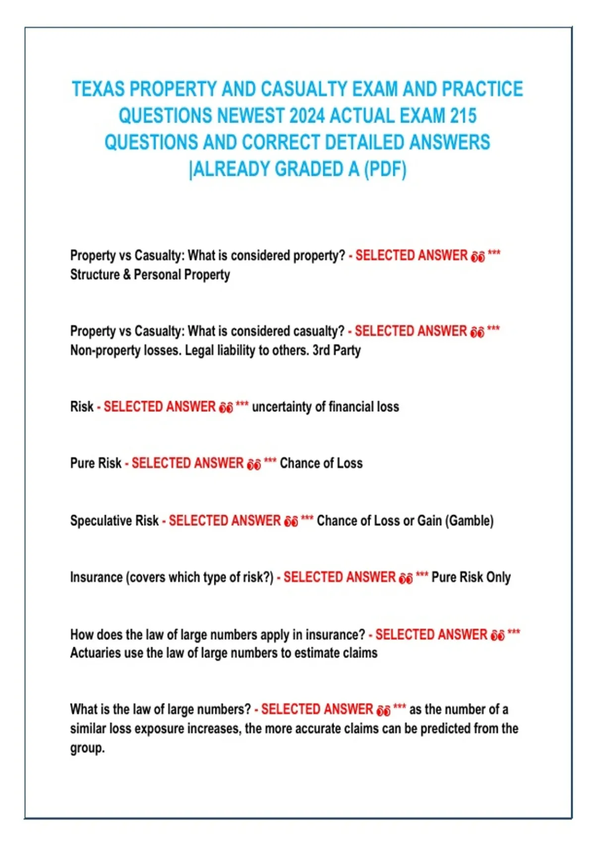 TEXAS PROPERTY AND CASUALTY EXAM AND PRACTICE QUESTIONS NEWEST 2024 ACTUAL EXAM 215 QUESTIONS AND CORRECT DETAILED ANSWERS |ALREADY GRADED A (PDF) Property vs Casualty: What is considered property? - SELECTED ANSWER *** Structure & Personal Property Property vs Casualty: What is considered casualty? - SELECTED ANSWER *** Non-property losses. Legal liability to others. 3rd Party Risk - SELECTED ANSWER *** uncertainty of financial loss Pure Risk - SELECTED ANSWER *** Chance of Loss Speculative Risk - SELECTED ANSWER *** Chance of Loss or Gain (Gamble) Insurance (covers which type of risk?) - SELECTED ANSWER *** Pure Risk Only
