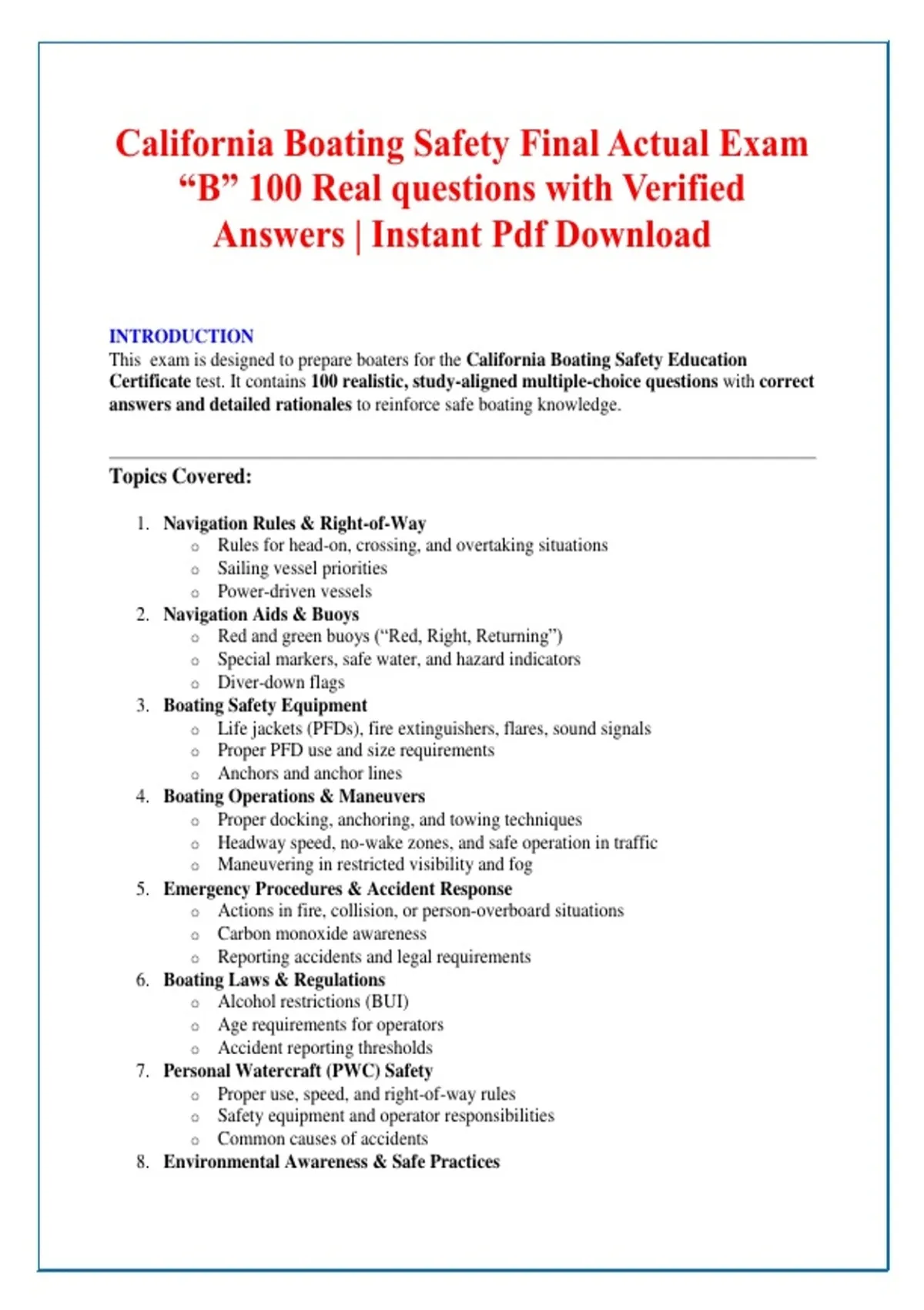This exam is designed to prepare boaters for the California Boating Safety Education Certificate test. It contains 100 realistic, study-aligned multiple-choice questions with correct answers and detailed rationales to reinforce safe boating knowledge. Topics Covered: 1. Navigation Rules & Right-of-Way o Rules for head-on, crossing, and overtaking situations o Sailing vessel priorities o Power-driven vessels 2. Navigation Aids & Buoys o Red and green buoys (“Red, Right, Returning”) o Special markers, safe water, and hazard indicators o Diver-down flags 3. Boating Safety Equipment o Life jackets (PFDs), fire extinguishers, flares, sound signals o Proper PFD use and size requirements o Anchors and anchor lines 4. Boating Operations & Maneuvers o Proper docking, anchoring, and towing techniques o Headway speed, no-wake zones, and safe operation in traffic o Maneuvering in restricted visibility and fog 5. Emergency Procedures & Accident Response o Actions in fire, collision, or person-overboard situations o Carbon monoxide awareness o Reporting accidents and legal requirements 6. Boating Laws & Regulations o Alcohol restrictions (BUI) o Age requirements for operators o Accident reporting thresholds 7. Personal Watercraft (PWC) Safety o Proper use, speed, and right-of-way rules o Safety equipment and operator responsibilities o Common causes of accidents 8. Environmental Awareness & Safe Practices o Effects of wakes and propeller hazards o Safe speed and lookout practices o Boating preparation: checking weather, fuel, and equipment
