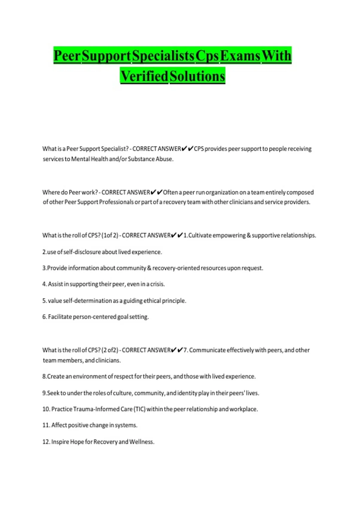 What is a Peer Support Specialist? - CORRECT ANSWER✔✔CPS provides peer support to people receiving