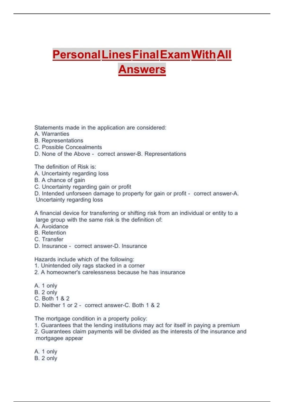PERSONAL LINES FINAL EXAM WITH ALL ANSWERS
