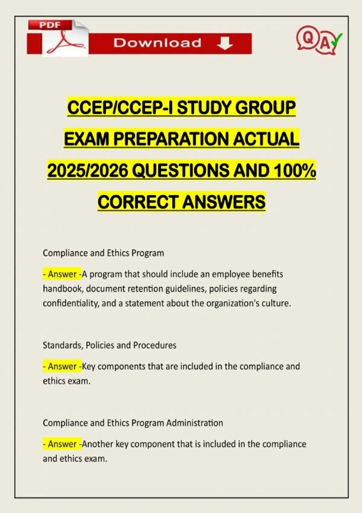 CCEP/CCEP-I STUDY GROUP EXAM PREPARATION ACTUAL 2025/2026 QUESTIONS AND 100% CORRECT ANSWERS Compliance and Ethics Program - Answer -A program that should include an employee benefits handbook, document retention guidelines, policies regarding confidentiality, and a statement about the organization's culture. Standards, Policies and Procedures - Answer -Key components that are included in the compliance and ethics exam. Compliance and Ethics Program Administration - Answer -Another key component that