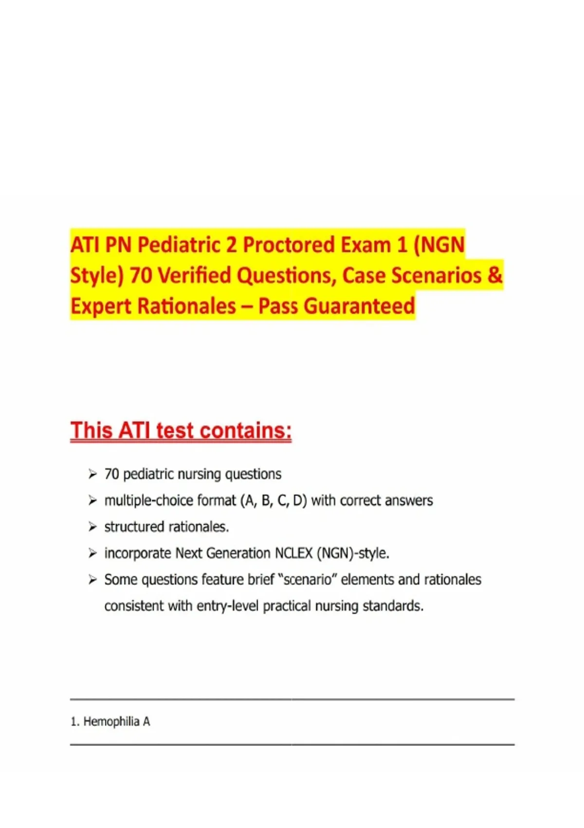 ATI PN Pediatric 2 Proctored Exam 1 (NGN Style) 70 Verified Questions, Case Scenarios & Expert Rationales – Pass Guaranteed Prepare confidently for your ATI PN Pediatric 2 Proctored Exam 1 with this Next Generation NCLEX (NGN) style resource, designed to mirror the actual exam format and guarantee success. This prep set includes 70 verified pediatric nursing questions, case scenarios, and expert‑written rationales to ensure you’re ready to pass on the first attempt. Features: - 70 Actual Pediatric Nursing Questions & Answers with structured rationales - NGN‑Style Case Scenarios & Select‑All‑That‑Apply Items integrated throughout - Expert‑Verified Rationales explaining correct and incorrect answers - Evidence‑Based Content aligned with ATI and NCLEX standards - 100% Pass Guarantee for exam readiness - Accessible Format for flexible study anytime, anywhere Sample Topics Covered: - Hematology: Hemophilia A manifestations (joint pain, hemarthrosis) - Nutrition & Growth: Toddler dietary teaching (1 tablespoon per year of age), celiac disease gluten‑free foods - Immunizations: Adolescent Tdap booster, parent refusal of infant vaccines (VIS requirement) - Pharmacology: Oral iron supplement teaching (use straw to prevent teeth staining) - Procedures & Skills: Administering ophthalmic drops (punctal occlusion to reduce systemic absorption) - Postoperative Care: Appendectomy complications (fever as infection indicator