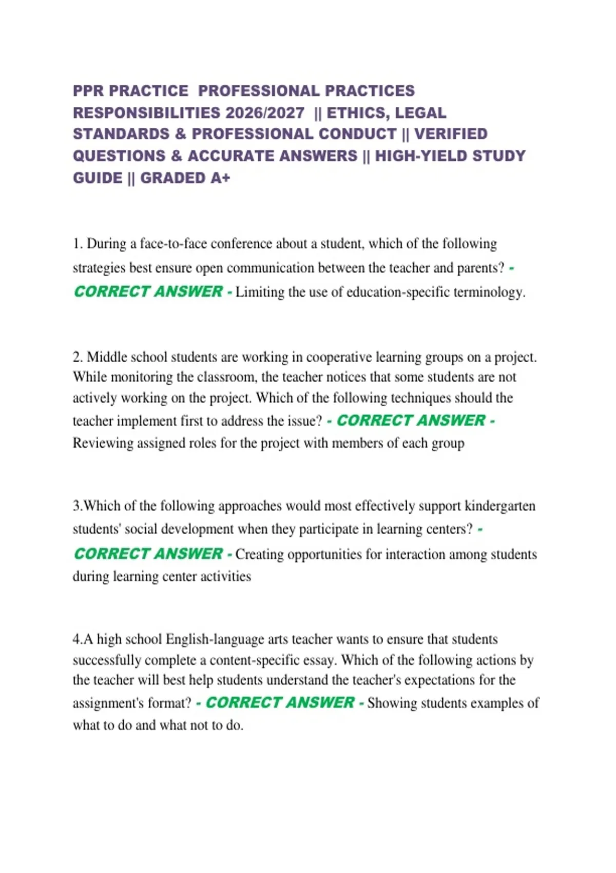 PPR PRACTICE PROFESSIONAL PRACTICES RESPONSIBILITIES 2026/2027 || ETHICS, LEGAL STANDARDS & PROFESSIONAL CONDUCT || VERIFIED QUESTIONS & ACCURATE ANSWERS || HIGH-YIELD STUDY GUIDE || GRADED A+ 1. During a face-to-face conference about a student, which of the following strategies best ensure open communication between the teacher and parents? - CORRECT ANSWER - Limiting the use of education-specific terminology.