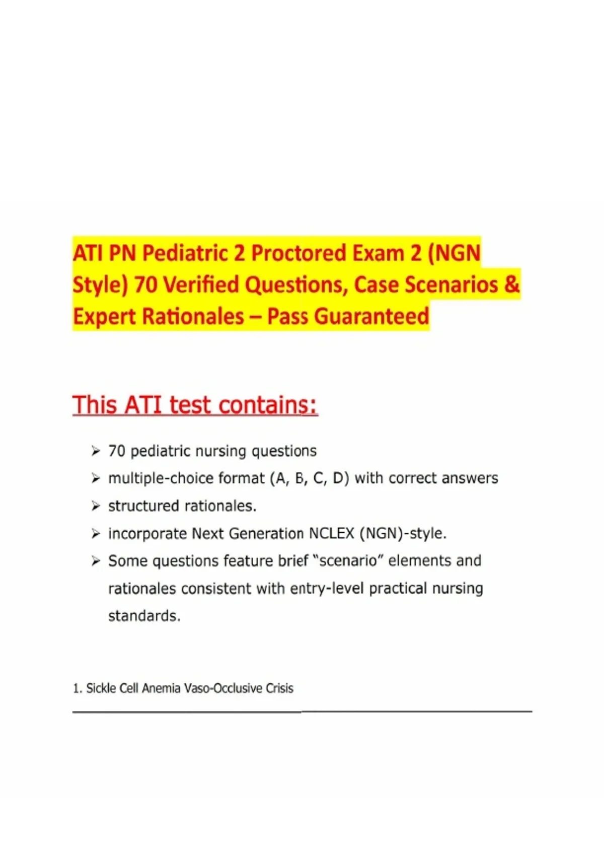 ATI PN Pediatric 2 Proctored Exam 2 (NGN Style) 70 Verified Questions, Case Scenarios & Expert Rationales – Pass Guaranteed Prepare confidently for your ATI PN Pediatric 2 Proctored Exam 2 with this Next Generation NCLEX (NGN) style resource, designed to mirror the actual exam format and guarantee success. This prep set includes 70 verified pediatric nursing questions, case scenarios, and expert‑written rationales to ensure you’re ready to pass on the first attempt. Features: - 70 Actual Pediatric Nursing Questions & Answers with structured rationales - NGN‑Style Case Scenarios & Select‑All‑That‑Apply Items integrated throughout - Expert‑Verified Rationales explaining correct and incorrect answers - Evidence‑Based Content aligned with ATI and NCLEX standards - 100% Pass Guarantee for exam readiness - Accessible Format for flexible study anytime, anywhere Sample Topics Covered: - Hematology: Sickle cell vaso‑occlusive crisis (oxygen priority intervention) - Orthopedics: Skeletal traction complications (paresthesia as early sign of compartment syndrome) - Cardiac Care: Post‑catheterization bleeding management and emergency response - Infection Control: Teaching for bacterial conjunctivitis and proper eye drop administration - Growth & Development: Vital signs for a 12‑month‑old (reporting abnormal BP) - Pharmacology: Ferrous sulfate adherence indicators (green, tarry stools) - Psychosocial: Risk factors for maltreatment (ADHD increasing caregiver stress) - Vision Disorders: Strabismus treatment with eye patching - Safety & Restraints: Swaddle restraint for toddlers during facial suturin