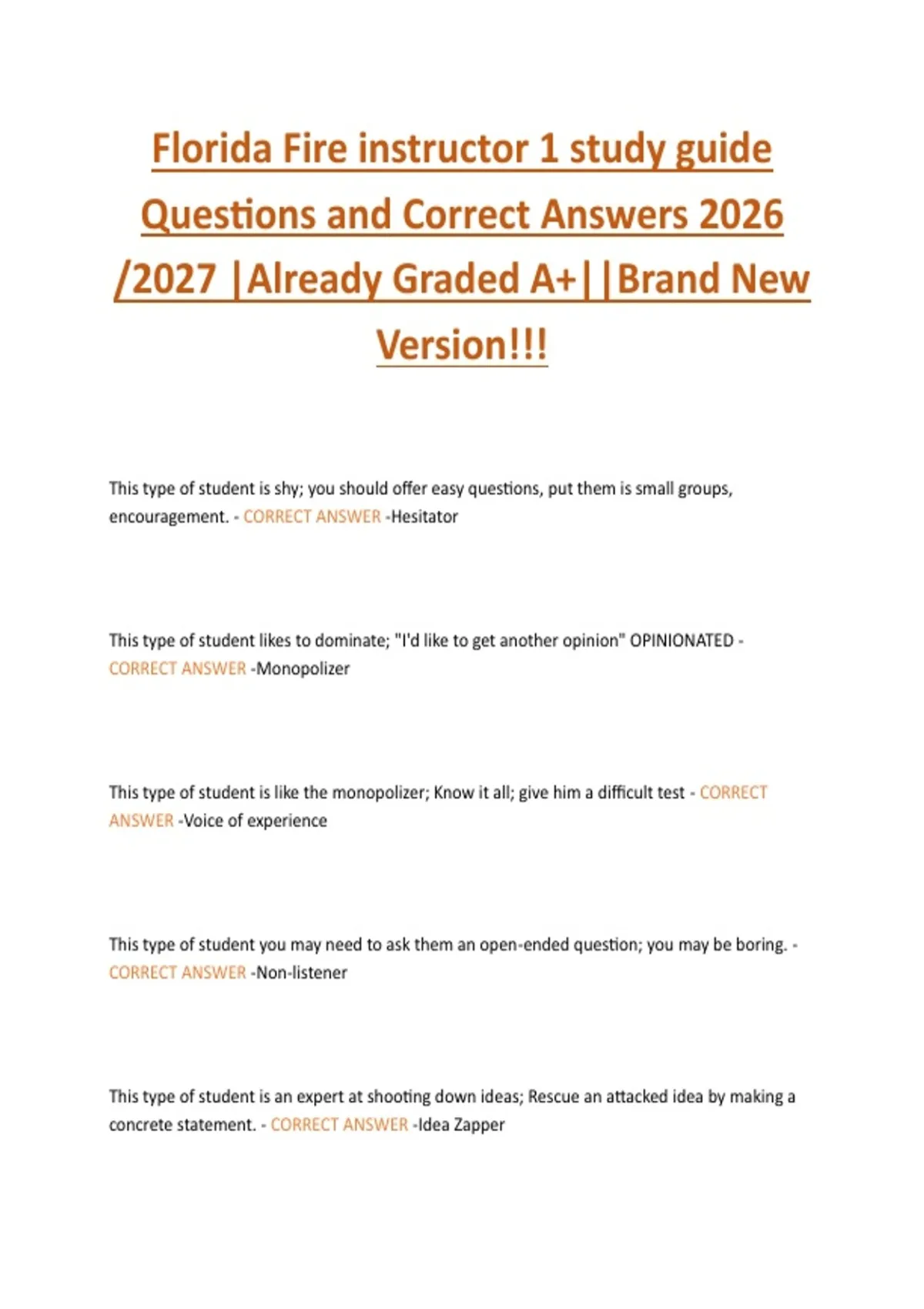 Florida Fire instructor 1 study guide Questions and Correct Answers 2026 /2027 |Already Graded A+||Brand New Version!!!