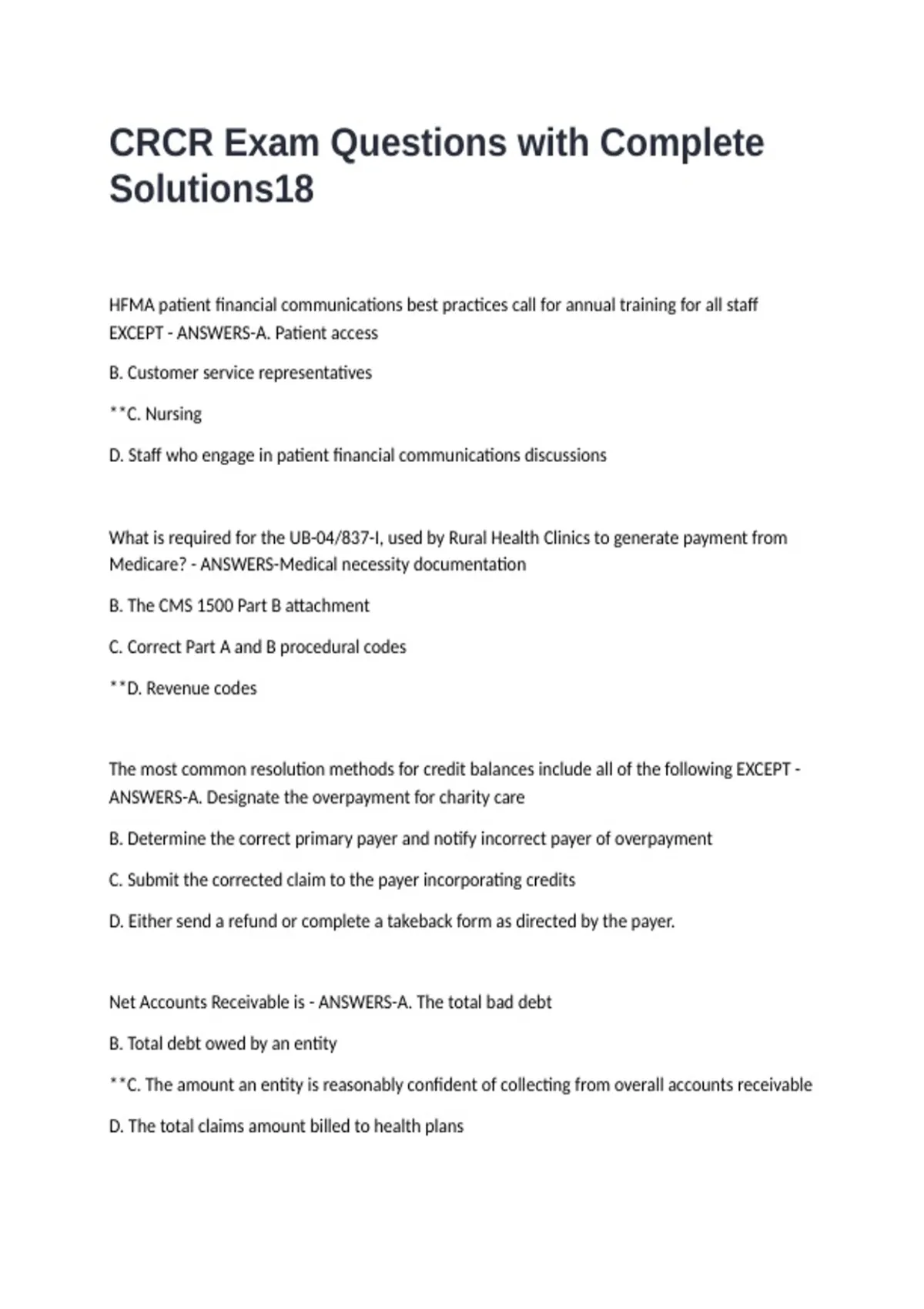 CRCR Exam Questions with Complete Solutions HFMA patient financial communications best practices call for annual training for all staff EXCEPT - ANSWERS-A. Patient access B. Customer service representatives **C. Nursing D. Staff who engage in patient financial communications discussions What is required for the UB-04/837-I, used by Rural Health Clinics to generate payment from Medicare? - ANSWERS-Medical necessity documentation B. The CMS 1500 Part B attachment C. Correct Part A and B procedural codes **D. Revenue codes The most common resolution methods for credit balances include all of the following EXCEPT - ANSWERS-A. Designate the overpayment for charity care B. Determine the correct primary payer and notify incorrect payer of overpayment C. Submit the corrected claim to the payer incorporating credits D. Either send a refund or complete a takeback form as directed by the payer. Net Accounts Receivable is - ANSWERS-A. The total bad debt B. Total debt owed by an entity **C. The amount an entity is reasonably confident of collecting from overall accounts receivable D. The total claims amount billed to health plans