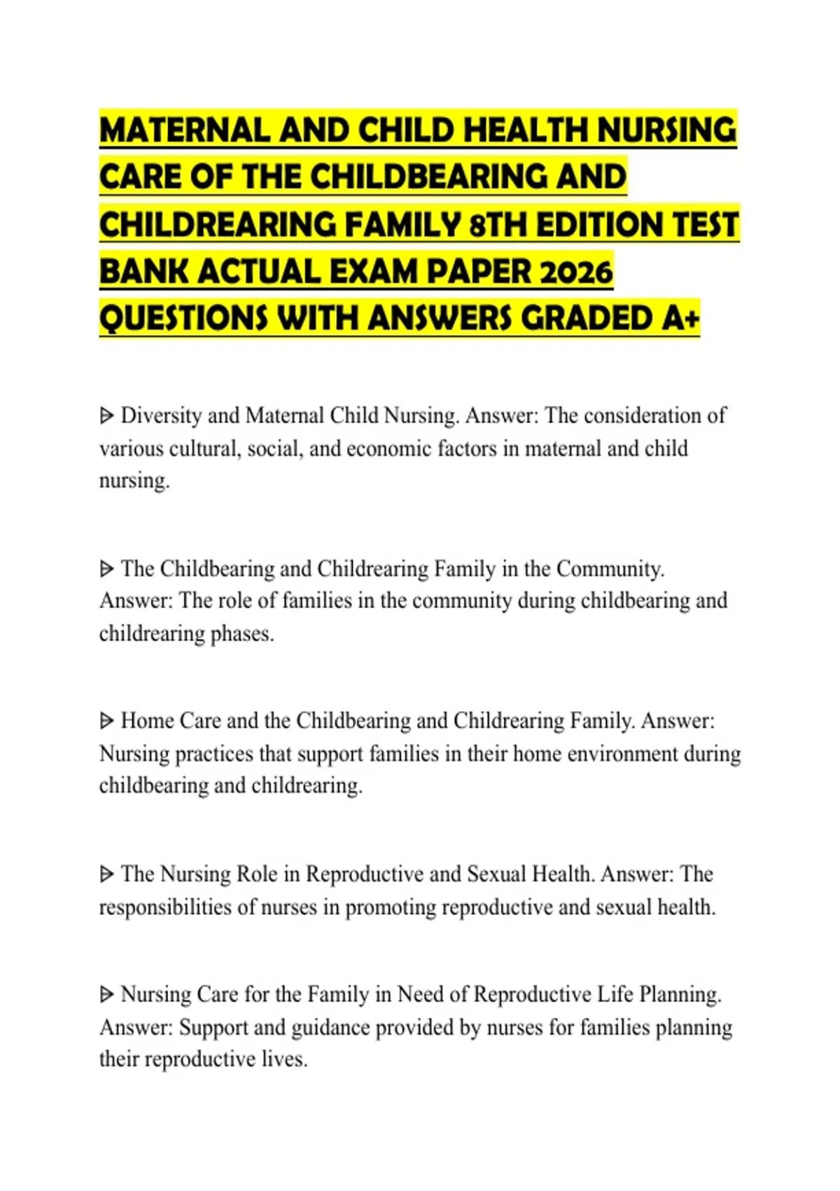 ⩥ Diversity and Maternal Child Nursing. Answer: The consideration of