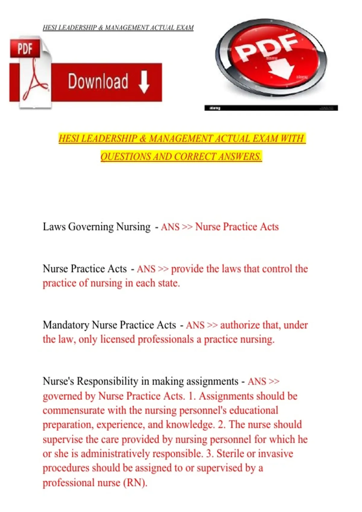 This document contains the actual HESI Leadership and Management exam questions with fully verified correct answers. It covers essential topics such as delegation, prioritization, team management, conflict resolution, ethical and legal considerations, and quality improvement, providing an accurate and practical resource for exam preparation.