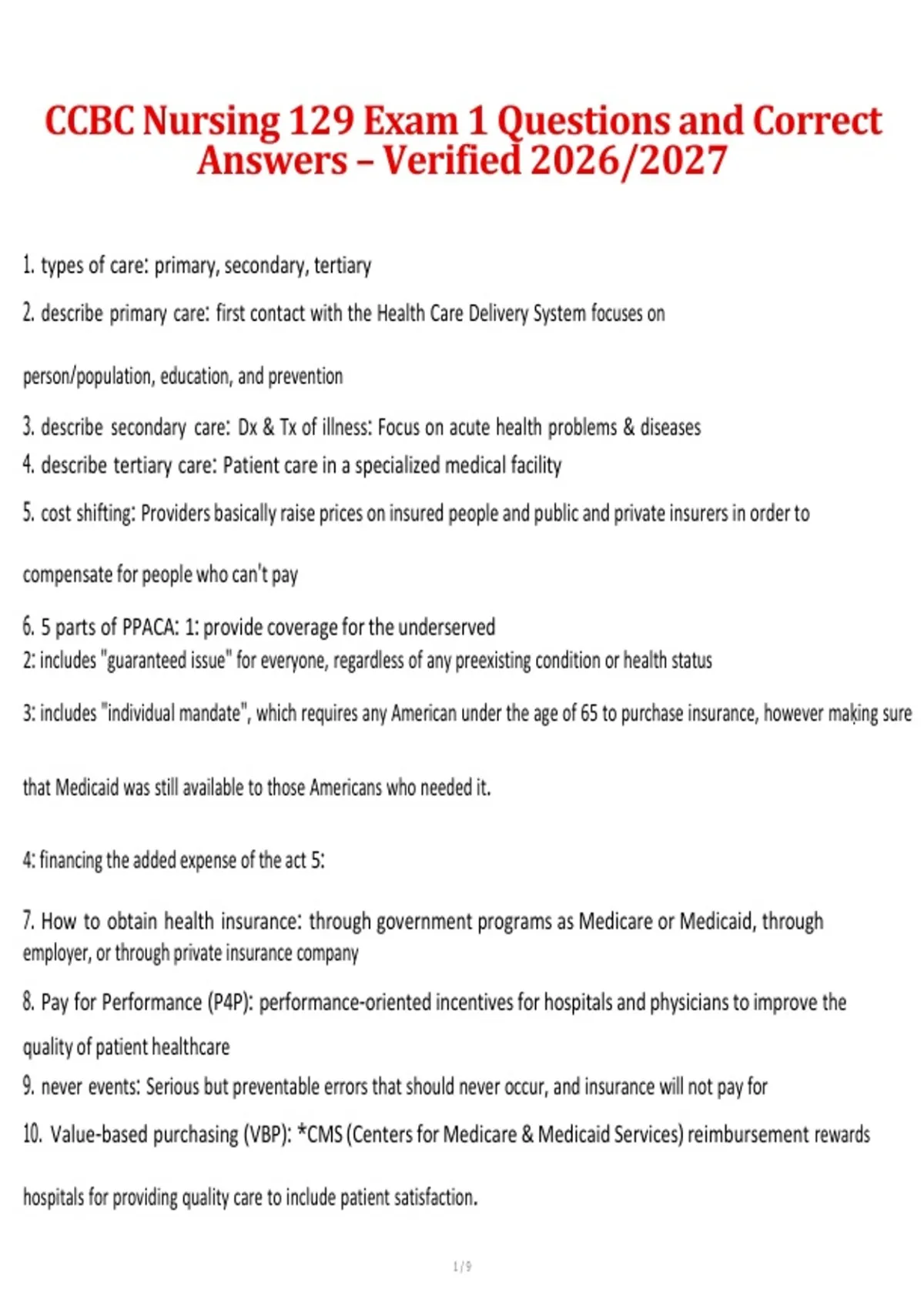 This document provides verified questions and correct answers for Nursing 129 Exam #1 at CCBC. It covers essential nursing concepts, terminology, and exam-focused material to support effective study and exam preparation. The content is clearly organized and aligned with the 2026/2027 academic year curriculum.