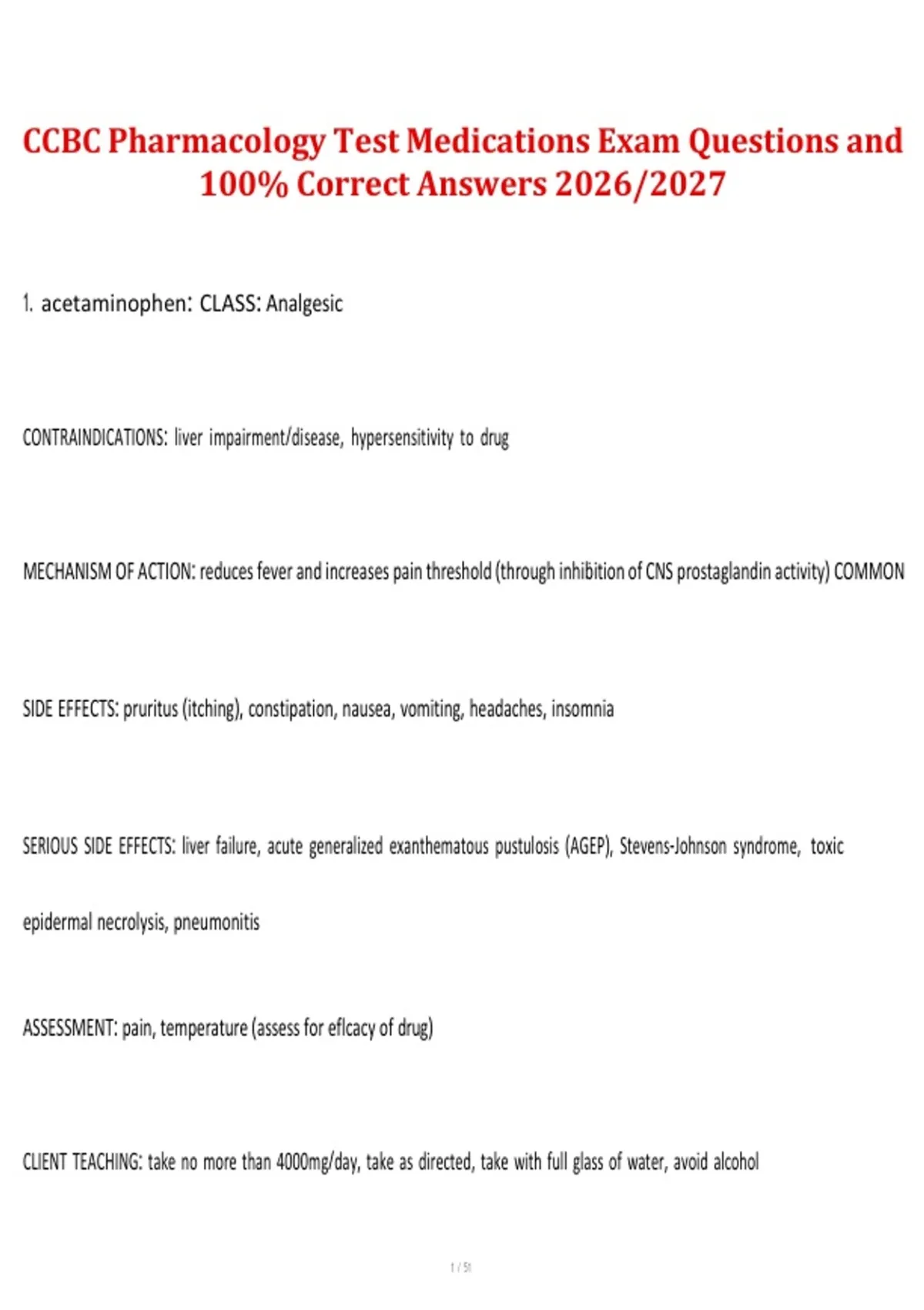This document includes exam-focused pharmacology questions with 100% correct answers for CCBC. It covers commonly tested medications, drug classifications, mechanisms of action, side effects, and nursing considerations. The material is designed to support accurate review and is aligned with the 2026/2027 academic year.