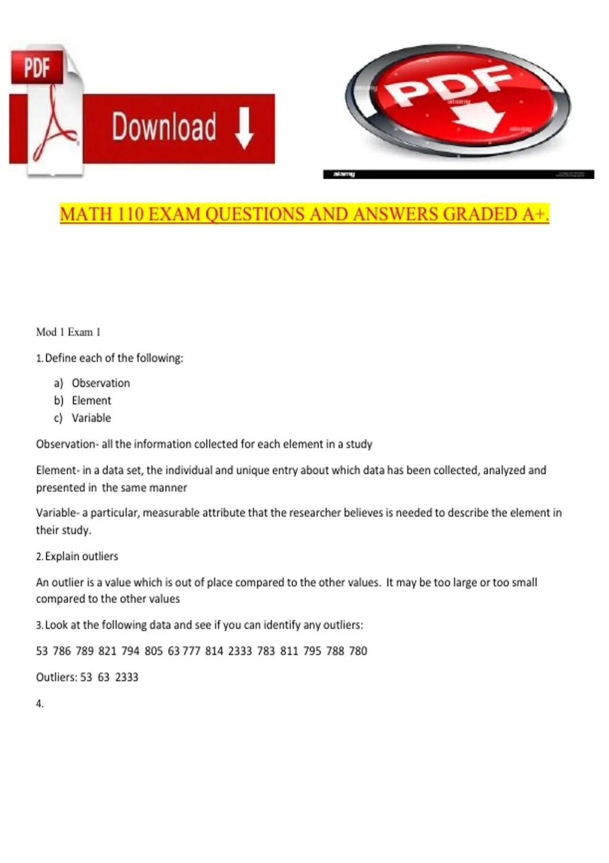 This document contains Math 110 exam questions with fully verified correct answers, covering core concepts typically taught in introductory college-level mathematics. Topics may include algebraic operations, functions, equations, graphs, and problem-solving techniques, making it a useful resource for exam review and practice.