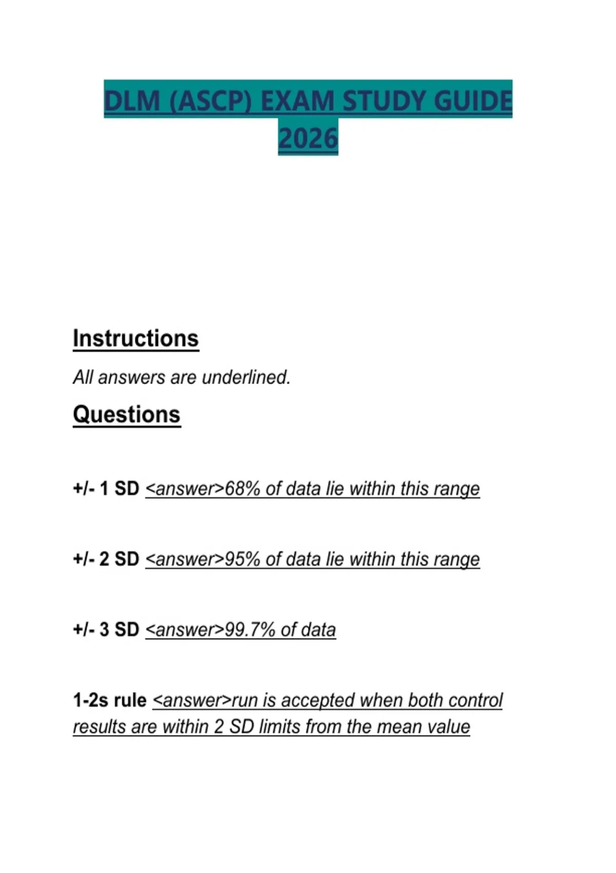 This document is a comprehensive study guide for the ASCP Diagnostic Laboratory Management (DLM) exam, covering key concepts in laboratory operations, quality management, statistics, safety, budgeting, staffing, informatics, and regulatory compliance. It includes concise definitions, formulas, rules, and management theories aligned with CLIA, OSHA, CAP, and Joint Commission standards, making it ideal for exam preparation and quick review for 2026 candidates.