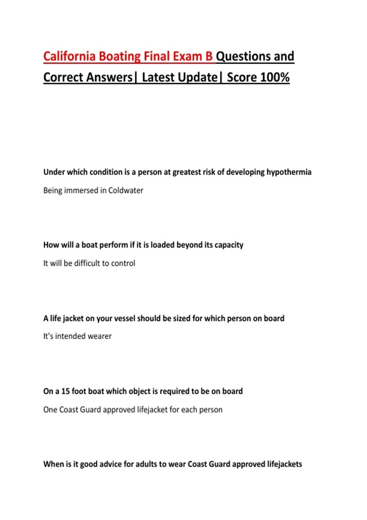 the full set of questions and correct answers for the California Boating Final Exam B, covering essential boating safety knowledge and state regulations. Topics include navigation rules, required safety equipment, alcohol laws, accident reporting, personal watercraft rules, and emergency procedures, making it ideal for exam preparation or review.