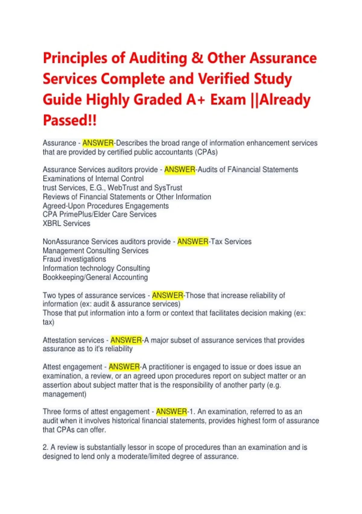 Confidently prepare for your Principles of Auditing exam. This verified study guide includes comprehensive coverage of all assurance services topics, practice questions, and study strategies for success.