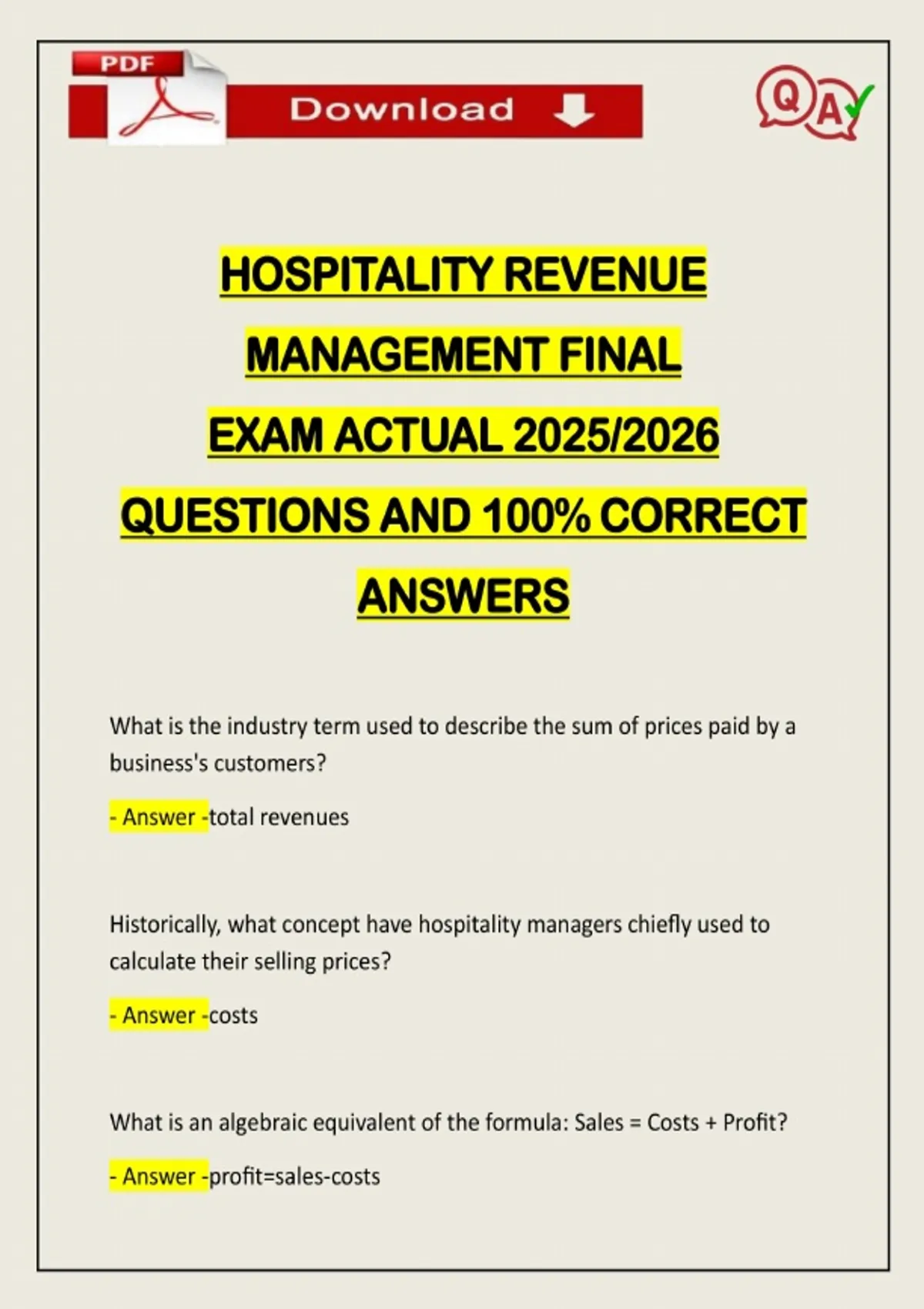 HOSPITALITY REVENUE MANAGEMENT FINAL EXAM ACTUAL 2025/2026 QUESTIONS AND 100% CORRECT ANSWERS What is the industry term used to describe the sum of prices paid by a business's customers? - Answer -total revenues Historically, what concept have hospitality managers chiefly used to calculate their selling prices? - Answer -costs What is an algebraic equivalent of the formula: Sales = Costs + Profit? - Answer -profit=sales-costsNeed assistance on Online classes, Exams & Assignments? Reach out for instant help!! Full Course Assistance, Plagiarism-free Essay Writing, Research Paper, Dissertation, Discussion Posts, etc…. Confidential & Secure services. Tutors are available for all subjects! Email now at: What is the name for the net value achieved by both parties in a business transaction? - Answer -profit What element is not present in a barter economy? - Answer -money What is the formula used to calculate an owner's ROI? - Answer -Owner's Investment Return / Owner's Original Investment = Owner's Return on Investment