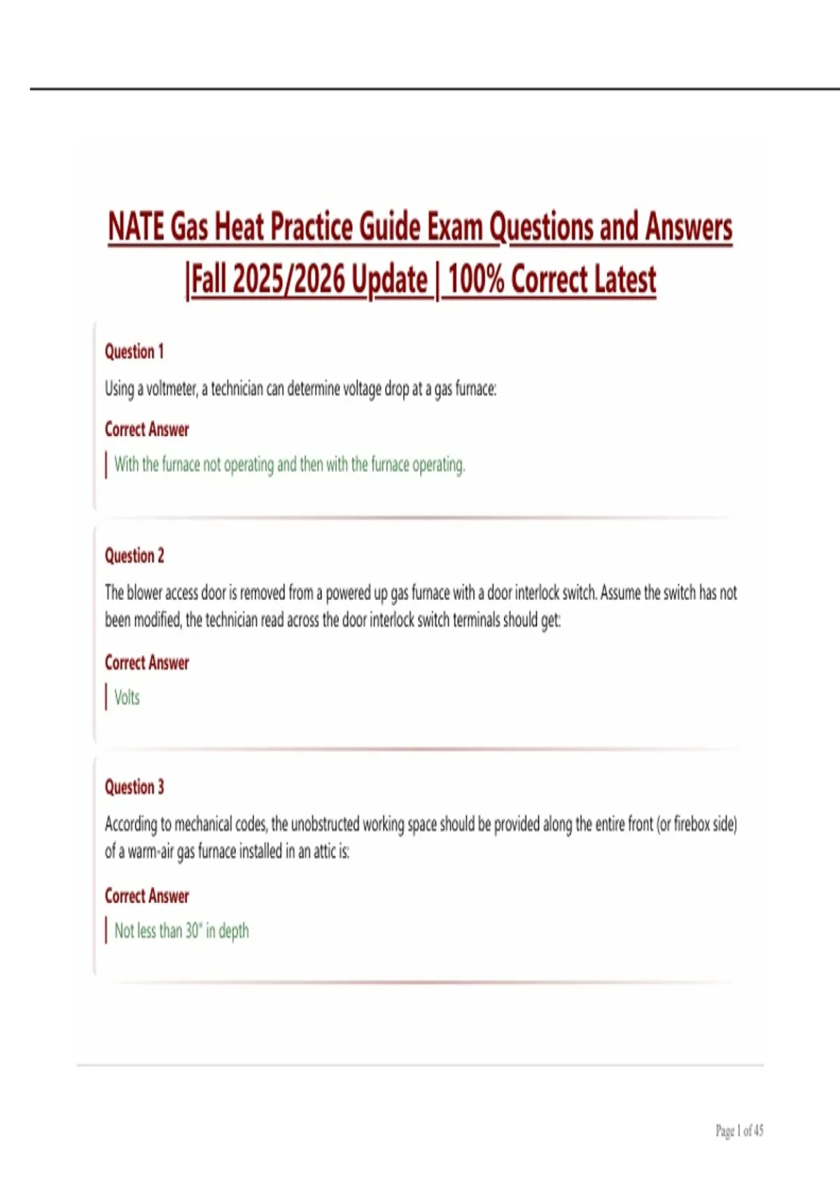 NATE Gas Heat Practice Guide Exam Questions and Answers |Fall 2025/2026 Update | 100% Correct Latest