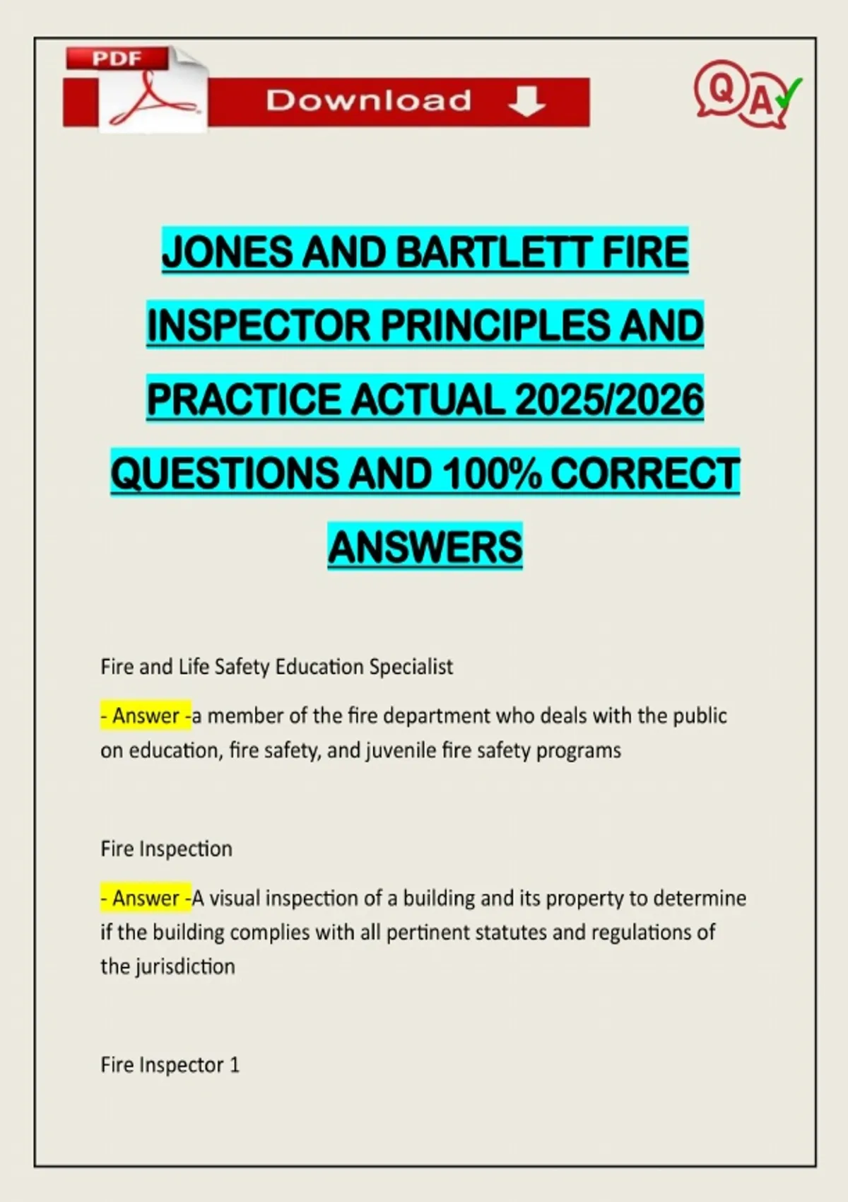 JONES AND BARTLETT FIRE INSPECTOR PRINCIPLES AND PRACTICE ACTUAL 2025/2026 QUESTIONS AND 100% CORRECT ANSWERS Fire and Life Safety Education Specialist - Answer -a member of the fire department who deals with the public on education, fire safety, and juvenile fire safety programs Fire Inspection - Answer -A visual inspection of a building and its property to determine if the building complies with all pertinent statutes and regulations of the jurisdiction Fire Inspector 1Need assistance on Online classes, Exams & Assignments? Reach out for instant help!! Full Course Assistance, Plagiarism-free Essay Writing, Research Paper, Dissertation, Discussion Posts, etc…. Confidential & Secure services. Tutors are available for all subjects! Email now at: - Answer -an individual at the first level of progression who has met the job performance requirements specified in this standard for level 1. the fire inspector conducts basic fire inspections and applies codes and standards NFPA1031 Fire Inspector 2 - Answer -individual at the first level of progression who has met the job performance requirements specified in this