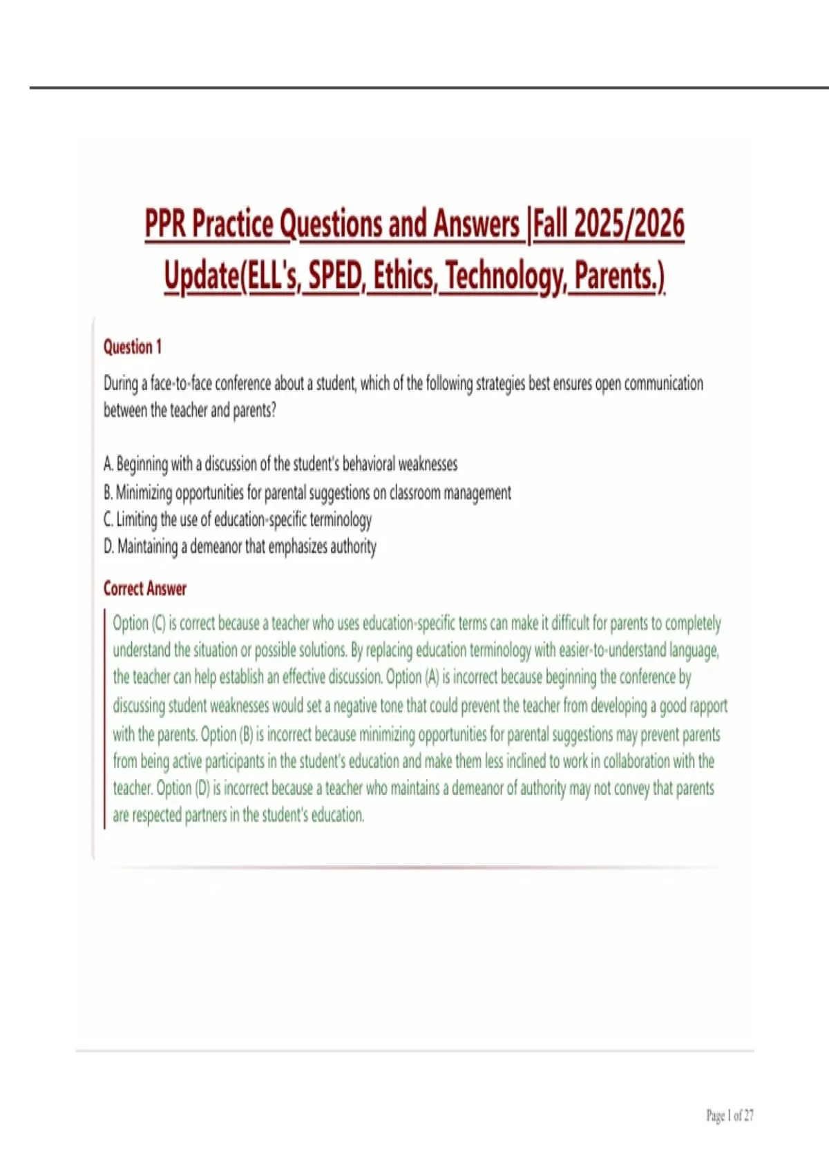 Option (C) is correct because a teacher who uses education-specific terms can make it difficult for parents to completely