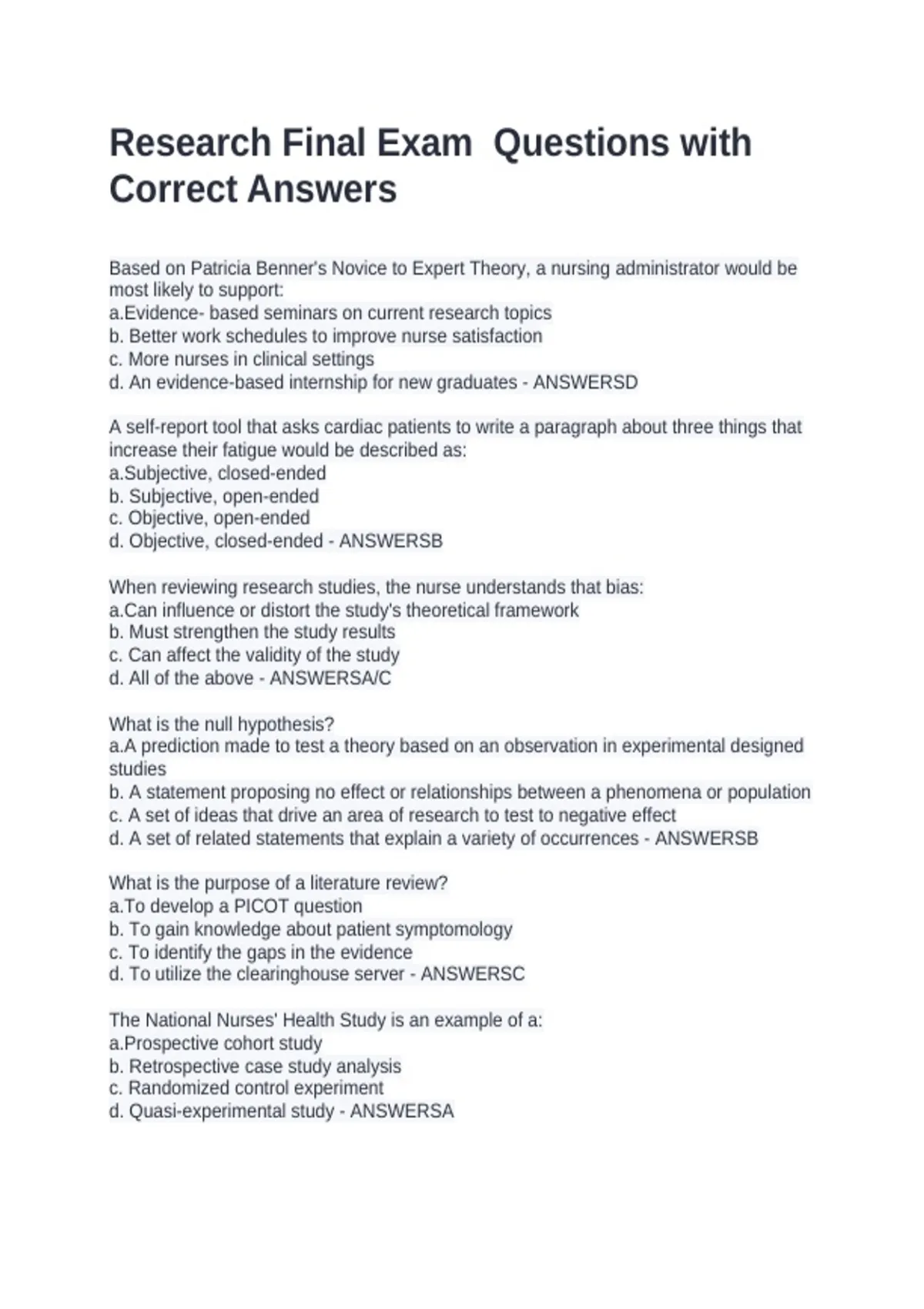 Based on Patricia Benner's Novice to Expert Theory, a nursing administrator would be most likely to support: a.Evidence- based seminars on current research topics b. Better work schedules to improve nurse satisfaction c. More nurses in clinical settings d. An evidence-based internship for new graduates - ANSWERSD A self-report tool that asks cardiac patients to write a paragraph about three things that increase their fatigue would be described as: a.Subjective, closed-ended b. Subjective, open-ended c. Objective, open-ended d. Objective, closed-ended - ANSWERSB When reviewing research studies, the nurse understands that bias: a.Can influence or distort the study's theoretical framework b. Must strengthen the study results c. Can affect the validity of the study d. All of the above - ANSWERSA/C What is the null hypothesis? a.A prediction made to test a theory based on an observation in experimental designed studies b. A statement proposing no effect or relationships between a phenomena or population c. A set of ideas that drive an area of research to test to negative effect d. A set of related statements that explain a variety of occurrences - ANSWERSB What is the purpose of a literature review? a.To develop a PICOT question b. To gain knowledge about patient symptomology c. To identify the gaps in the evidence d. To utilize the clearinghouse server - ANSWERSC The National Nurses' Health Study is an example of a: a.Prospective cohort study b. Retrospective case study analysis c. Randomized control experiment d. Quasi-experimental study - ANSWERSA