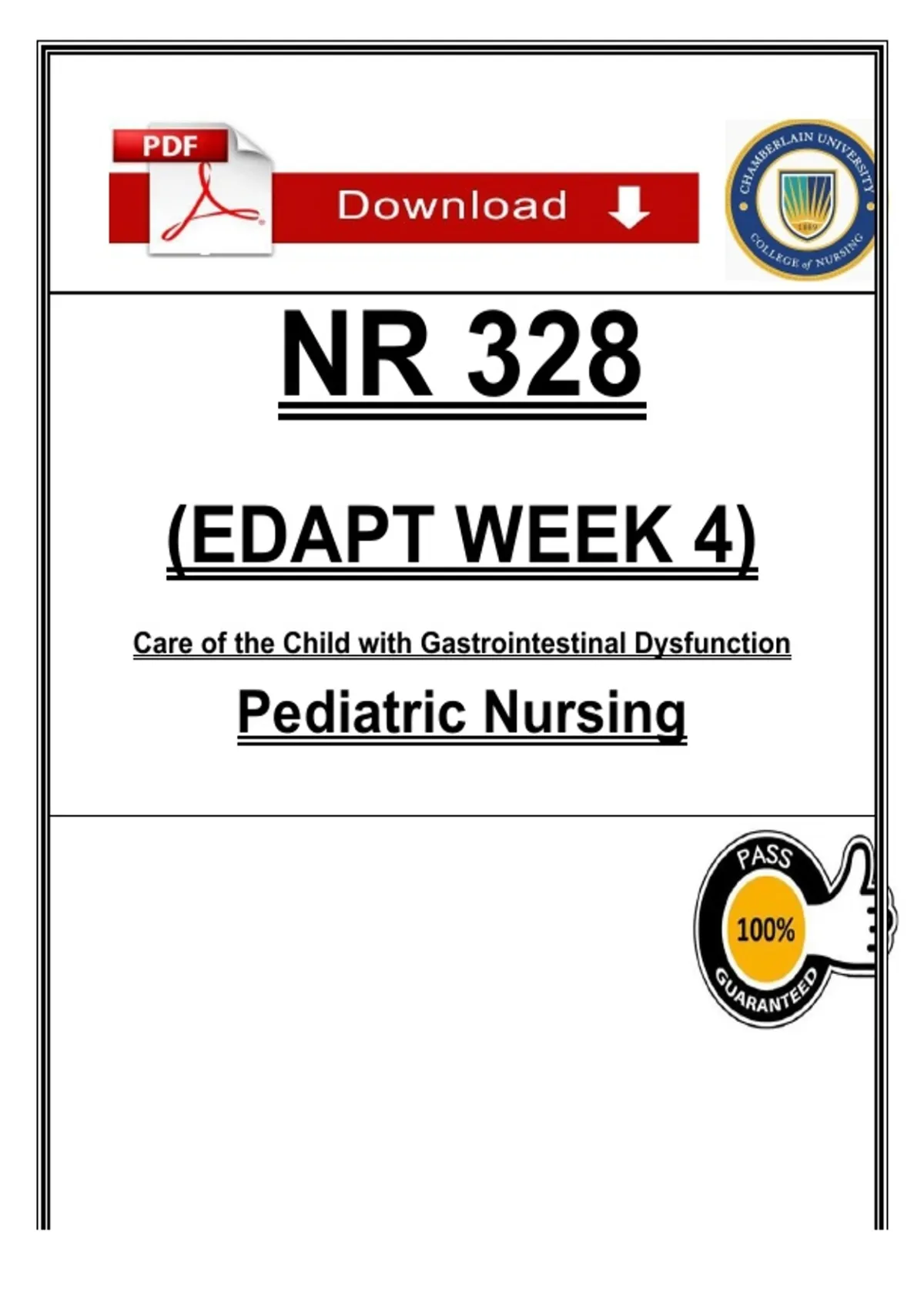 INSTANT PDF DOWNLOAD — This NR 328 EDAPT Week 4 study guide focuses on the Care of the Child with Gastrointestinal Dysfunction in Pediatric Nursing. The notes cover common pediatric GI disorders, assessment findings, dehydration and fluid balance, nutrition considerations, nursing interventions, diagnostic tests, and family education. Content is organized for quick understanding and exam preparation, aligned with EDAPT objectives and Chamberlain College of Nursing coursework. Ideal for quizzes, exams, and clinical concept review. Digital download only—no physical item shipped. NR 328 notes, NR328 week 4, pediatric GI nursing, EDAPT week 4, gastrointestinal pediatric notes, pediatric nursing PDF, child GI disorders nursing, pediatric dehydration nursing, nursing exam study guide, Chamberlain NR 328, EDAPT nursing notes, pediatric GI assessment, pediatric nursing exam, nursing student study PDF, GI dysfunction pediatrics, pediatric care notes