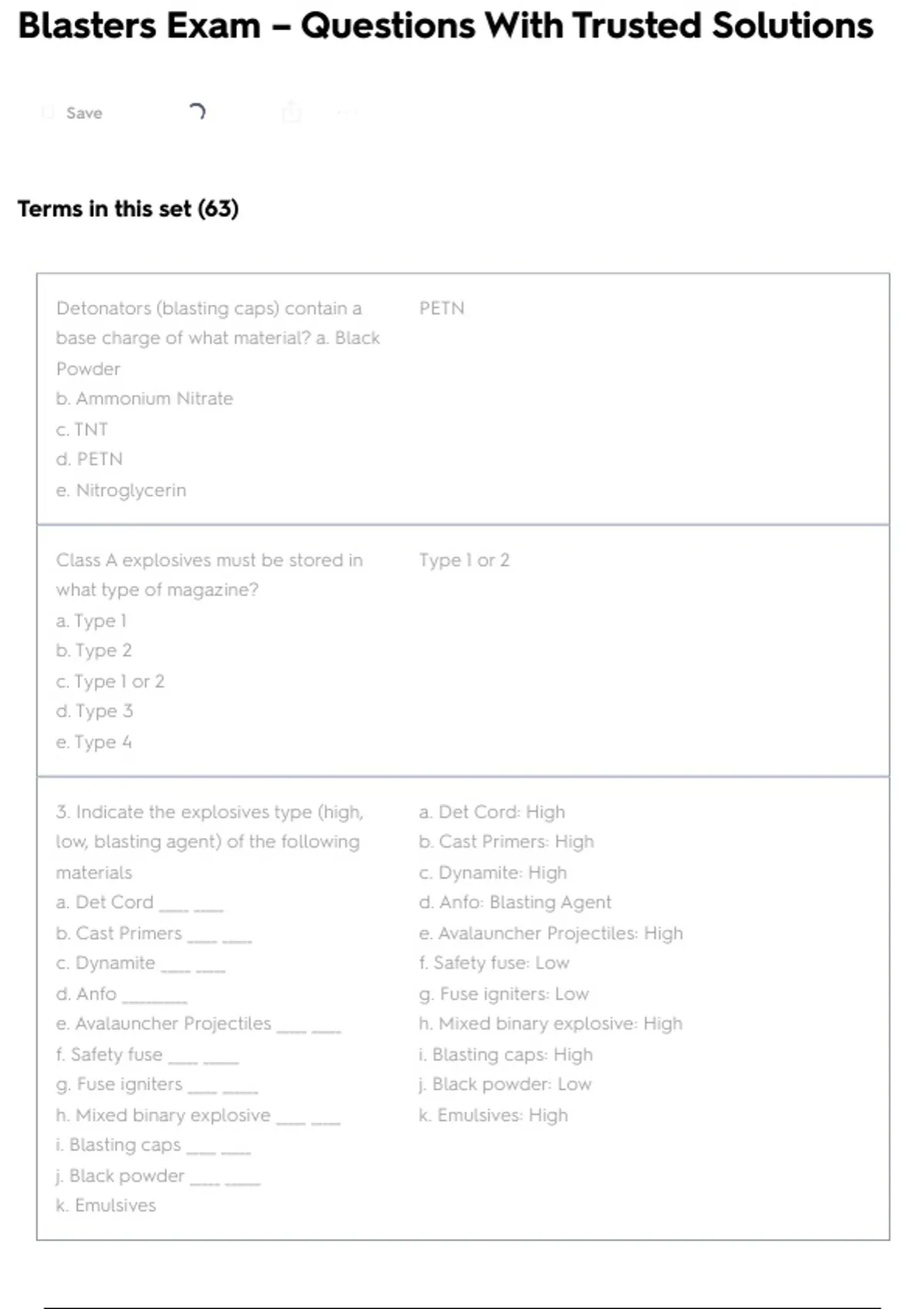a. Det Cord _____ _____ d. Anfo: Blasting Agent