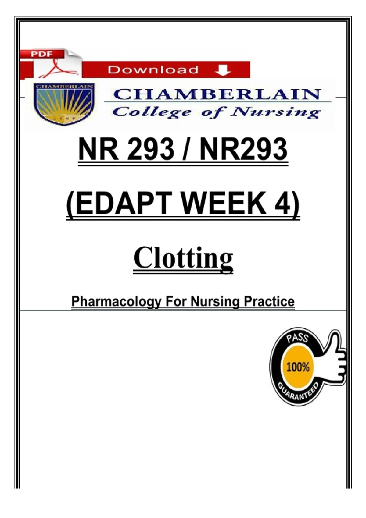 INSTANT PDF DOWNLOAD — This NR 293 / NR293 EDAPT Week 4 study guide covers Clotting and Hemostasis in Pharmacology for Nursing Practice. Topics include the coagulation cascade, intrinsic and extrinsic pathways, platelet function, clotting disorders, anticoagulants, antiplatelet agents, thrombolytics, reversal agents, laboratory monitoring (PT/INR, aPTT), bleeding risks, contraindications, drug interactions, patient education, safety precautions, and essential nursing interventions. Content is clearly organized to align with EDAPT quizzes, exams, and Chamberlain NR 293 coursework, making it ideal for focused review and exam preparation. Digital download only—no physical item will be shipped. NR 293 notes, NR293 week 4, EDAPT week 4, clotting nursing, coagulation nursing, anticoagulant nursing, antiplatelet drugs, thrombolytics nursing, pharmacology nursing PDF, Chamberlain NR 293, EDAPT nursing notes, nursing exam study guide, nursing pharmacology study, INR PT nursing, bleeding disorders nursing, hemostasis nursing
