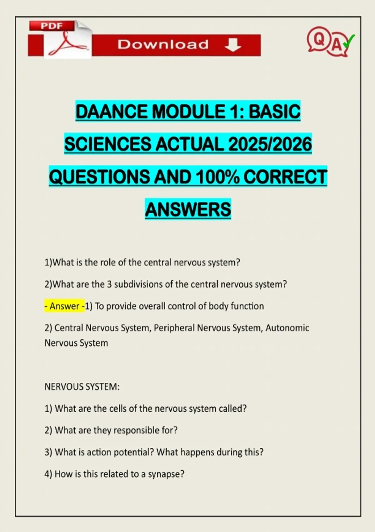 DAANCE MODULE 1: BASIC SCIENCES ACTUAL 2025/2026 QUESTIONS AND 100% CORRECT ANSWERS 1)What is the role of the central nervous system? 2)What are the 3 subdivisions of the central nervous system? - Answer -1) To provide overall control of body function 2) Central Nervous System, Peripheral Nervous System, Autonomic Nervous System NERVOUS SYSTEM: 1) What are the cells of the nervous system called? 2) What are they responsible for? 3) What is action potential? W