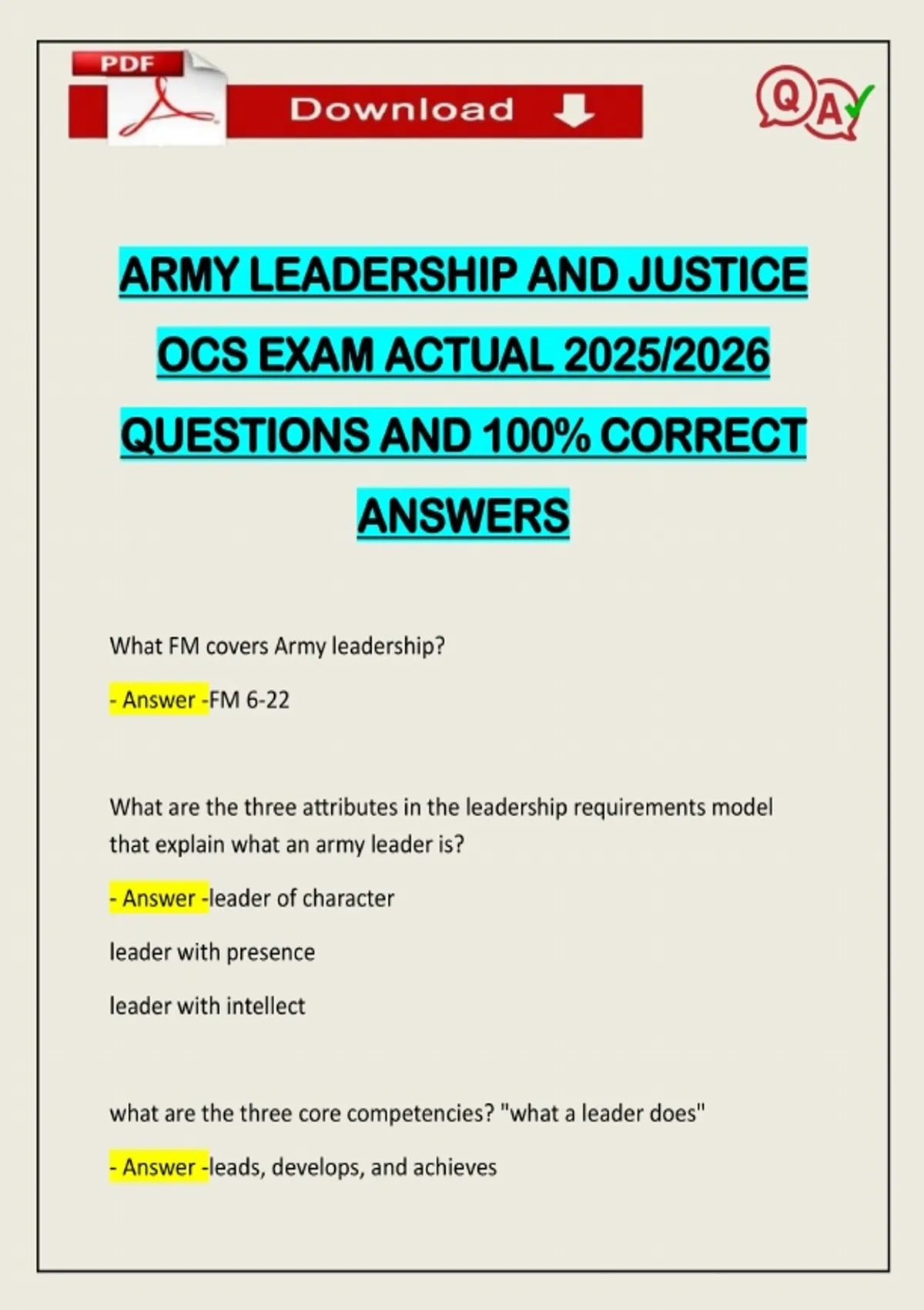 ARMY LEADERSHIP AND JUSTICE OCS EXAM ACTUAL 2025/2026 QUESTIONS AND 100% CORRECT ANSWERS What FM covers Army leadership? - Answer -FM 6-22 What are the three attributes in the leadership requirements model that explain what an army leader is? - Answer -leader of character leader with presence