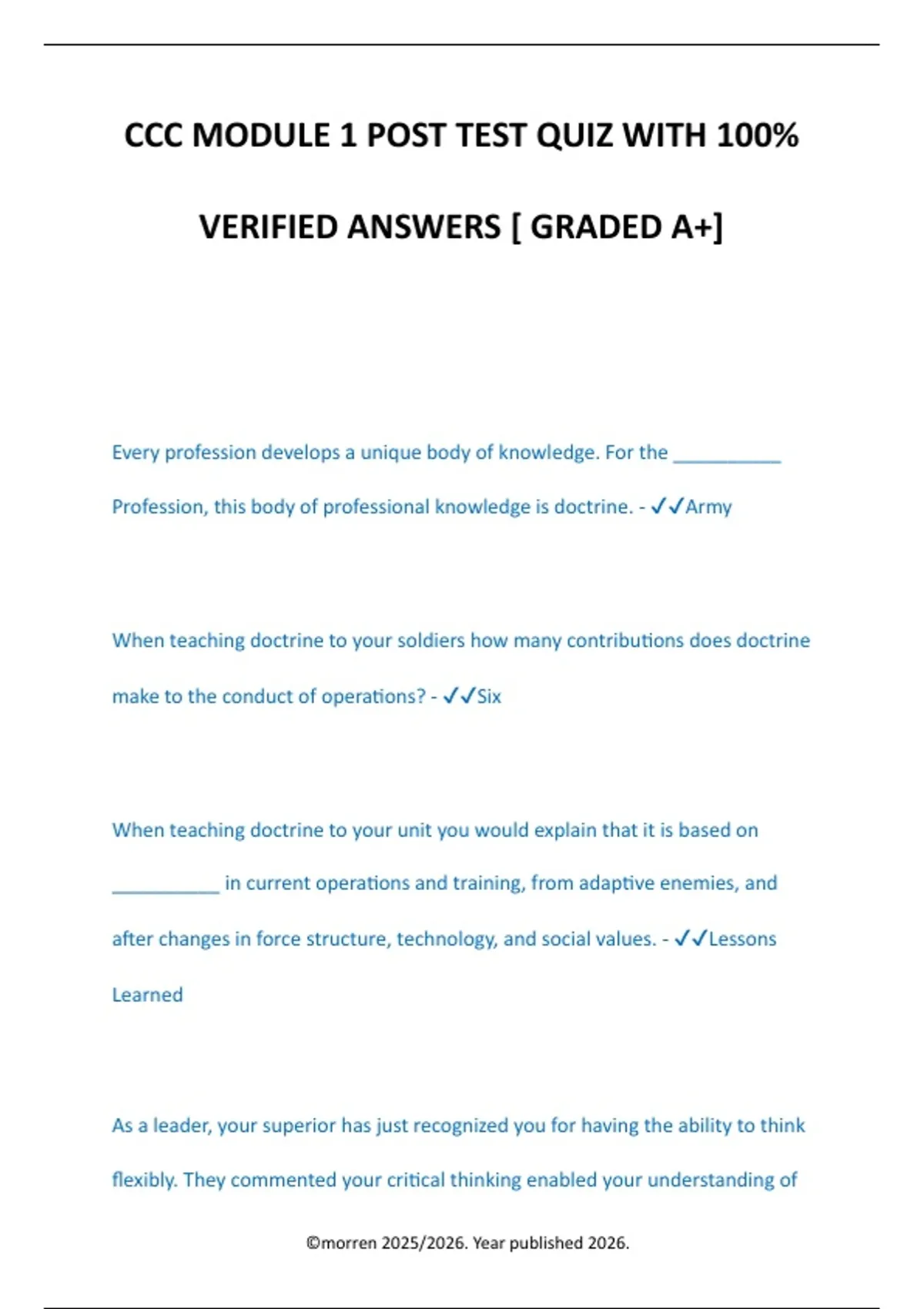 CCC MODULE 1 POST TEST QUIZ WITH 100% VERIFIED ANSWERS [ GRADED A+] Every profession develops a unique body of knowledge. For the __________ Profession, this body of professional knowledge is doctrine. - Army When teaching doctrine to your soldiers how many contributions does doctrine make to the conduct of operations? - Six When teaching doctrine to your unit you would explain that it is based on __________ in current operations and training, from adaptive enemies, and after changes in force structure, technology, and social values. - Lessons Learned As a leader, your superior has just recognized you for having the ability to think f lexibly. They commented your critical thinking enabled your understanding of ©morren 2025/2026. Year published 2026. changing situations, arriving at justifiable conclusions, making judgments, and learning from experience. Which of the foundations of army leader intellect have you shown proficiency in? - Mental Agility During the Spanish-American War, Lieutenant John Parker led his detachment in the capture of San Juan Hill. LT Parker believed the Gatling Gun was more than a defensive weapon as outlined in current doctrine. He requested and received permission to use Gatling Guns in a close support role during the attack. LT Parker's intellect resulted in the first step in developing the principle of fire and maneuver. Which of the following aspects of intellect did LT Parker demonstrate? - Innovation Many people expressed discontent when the Army transitioned from the APFT to the ACFT. This is an example of which type of barrier to critical thinking? - Status Quo Bias You have been tasked with leading your staff to review and improve the organizational culture of your department. You invite a local CEO to be a part of ©morren 2025/2026. Year published 2026.