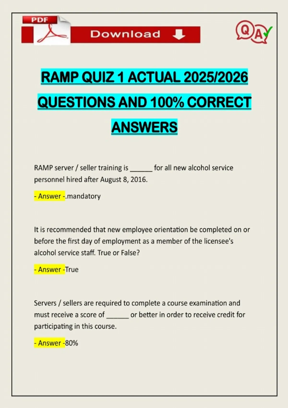 RAMP QUIZ 1 ACTUAL 2025/2026 QUESTIONS AND 100% CORRECT ANSWERS RAMP server / seller training is ______ for all new alcohol service personnel hired after August 8, 2016. - Answer -.mandatory It is recommended that new employee orientation be completed on or before the first day of employment as a member of the licensee's alcohol service staff. True or False? - Answer -True Servers / sellers are required to complete a course examination and must receive a score of ______ or better in order to receive credit for participating in this course.