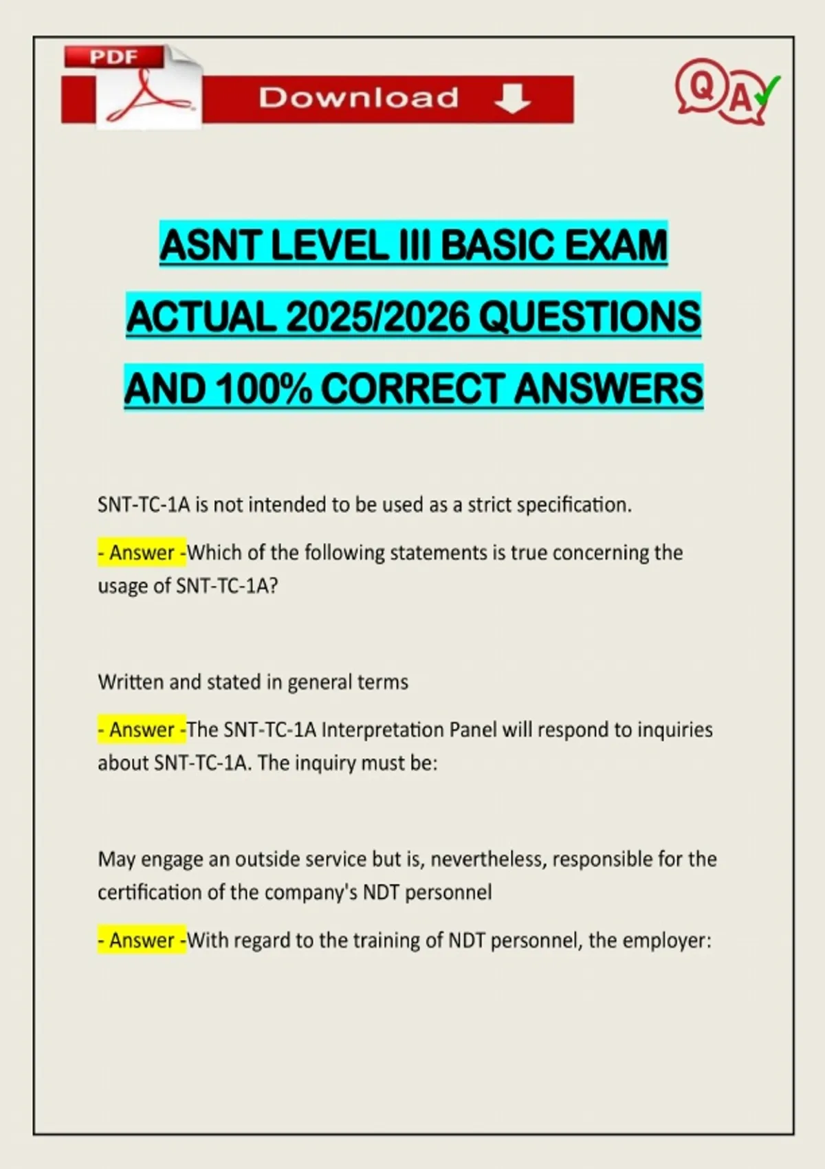 ASNT LEVEL III BASIC EXAM ACTUAL 2025/2026 QUESTIONS AND 100% CORRECT ANSWERS SNT-TC-1A is not intended to be used as a strict specification. - Answer -Which of the following statements is true concerning the usage of SNT-TC-1A? Written and stated in general terms - Answer -The SNT-TC-1A Interpretation Panel will respond to inquirie