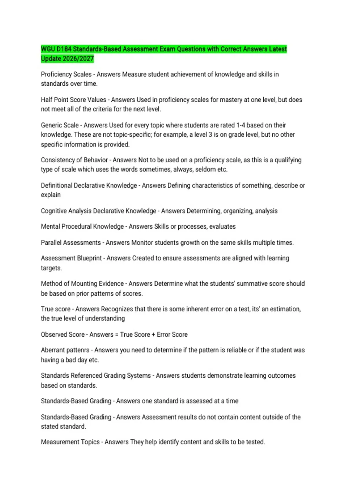 WGU D184 Standards-Based Assessment Exam Questions with Correct Answers Latest Update 2026/2027 Proficiency Scales - Answers Measure student achievement of knowledge and skills in standards over time. Half Point Score Values - Answers Used in proficiency scales for mastery at one level, but does not meet all of the criteria for the next level. Generic Scale - Answers Used for every topic where students are rated 1-4 based on their knowledge. These are not topic-specific; for example, a level 3 is on grade level, but no other specific information is provided. Consistency of Behavior - Answers Not to be used on a proficiency scale, as this is a qualifying type of scale which uses the words sometimes, always, seldom etc. Definitional Declarative Knowledge - Answers Defining characteristics of something, describe or explain Cognitive Analysis Declarative Knowledge - Answers Determining, organizing, analysis Mental Procedural Knowledge - Answers Skills or processes, evaluates Parallel Assessments - Answers Monitor students growth on the same skills multiple times. Assessment Blueprint - Answers Created to ensure assessments are aligned with learning targets. Method of Mounting Evidence - Answers Determine what the students' summative score should be based on prior patterns of scores. True score - Answers Recognizes that there is some inherent error on a test, its' an estimation, the true level of understanding Observed Score - Answers = True Score + Error Score Aberrant pattenrs - Answers you need to determine if the pattern is reliable or if the student was having a bad day etc. Standards Referenced Grading Systems - Answers students demonstrate learning outcomes based on standards. Standards-Based Grading - Answers one standard is assessed at a time Standards-Based Grading - Answers Assessment results do not contain content outside of the stated standard. Measurement Topics - Answers They help identify content and skills to be tested. Measurement Topics - Answers Concepts Declarative Knowledge - Answers Understanding concepts without application Procedural Knowledge - Answers Demonstration is a method of illustrating procedural knowledge Parallel Assessments - Answers given to measure student progress on one standard over time Unidimensionality - Answers Parallel Assessments