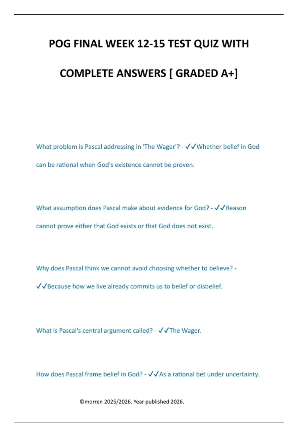 , What is Blackburn's main goal in critiquing Pascal? - ✔✔To show that Pascal's