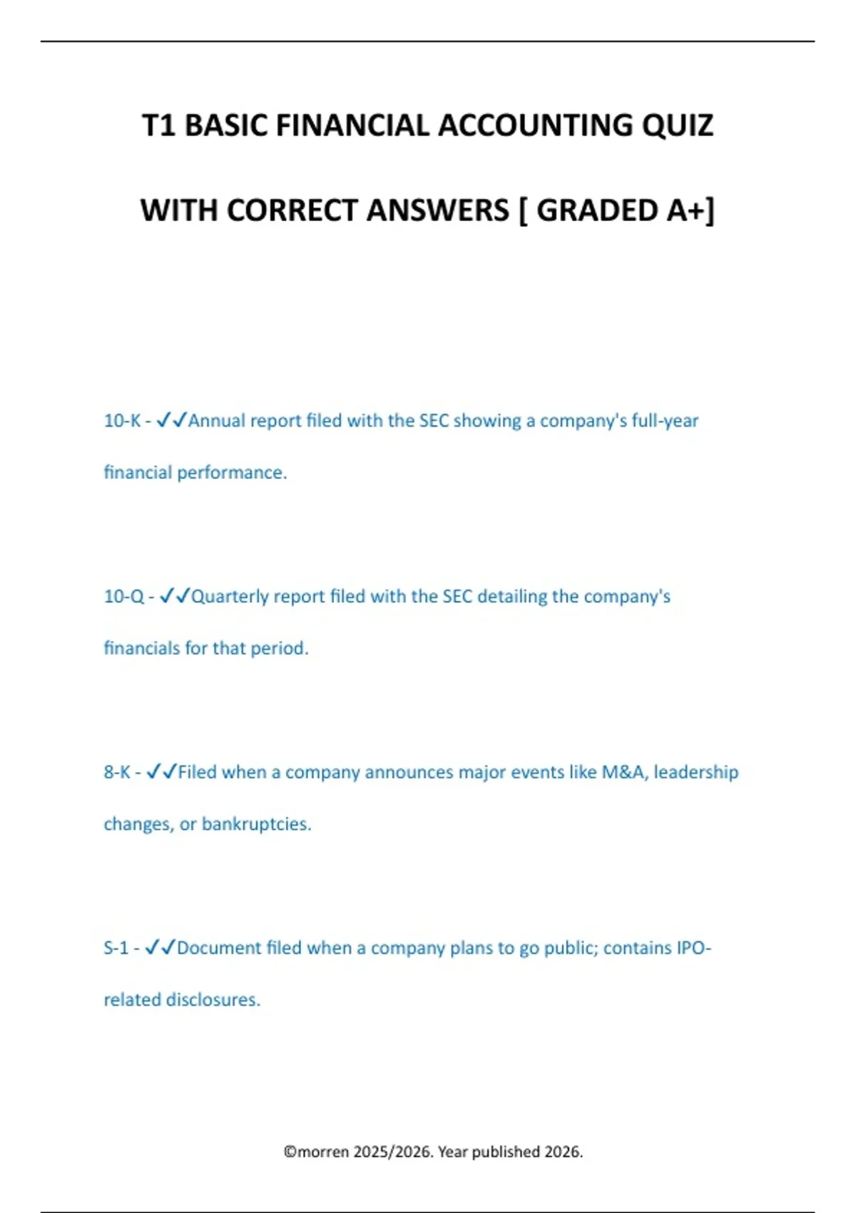 T1 BASIC FINANCIAL ACCOUNTING QUIZ WITH CORRECT ANSWERS [ GRADED A+] 10-K - Annual report filed with the SEC showing a company's full-year f inancial performance. 10-Q - Quarterly report filed with the SEC detailing the company's f inancials for that period. 8-K - Filed when a company announces major events like M&A, leadership changes, or bankruptcies. S-1 - Document filed when a company plans to go public; contains IPO related disclosures. ©morren 2025/2026. Year published 2026.