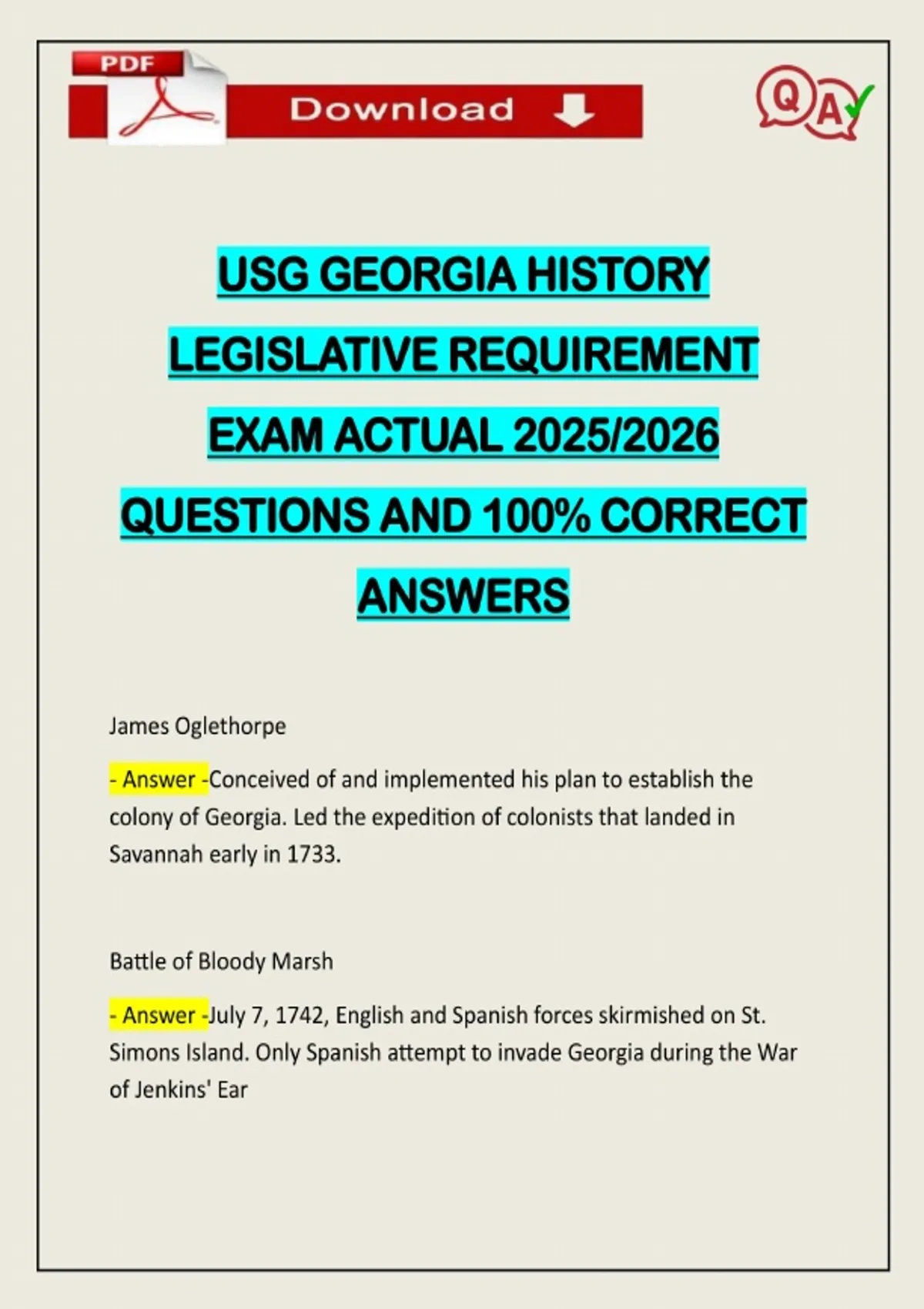 USG GEORGIA HISTORY LEGISLATIVE REQUIREMENT EXAM ACTUAL 2025/2026 QUESTIONS AND 100% CORRECT ANSWERS James Oglethorpe - Answer -Conceived of and implemented his plan to establish the colony of Georgia. Led the expedition of colonists that landed in Savannah early in 1733. Battle of Bloody Marsh - Answer -July 7, 1742, English