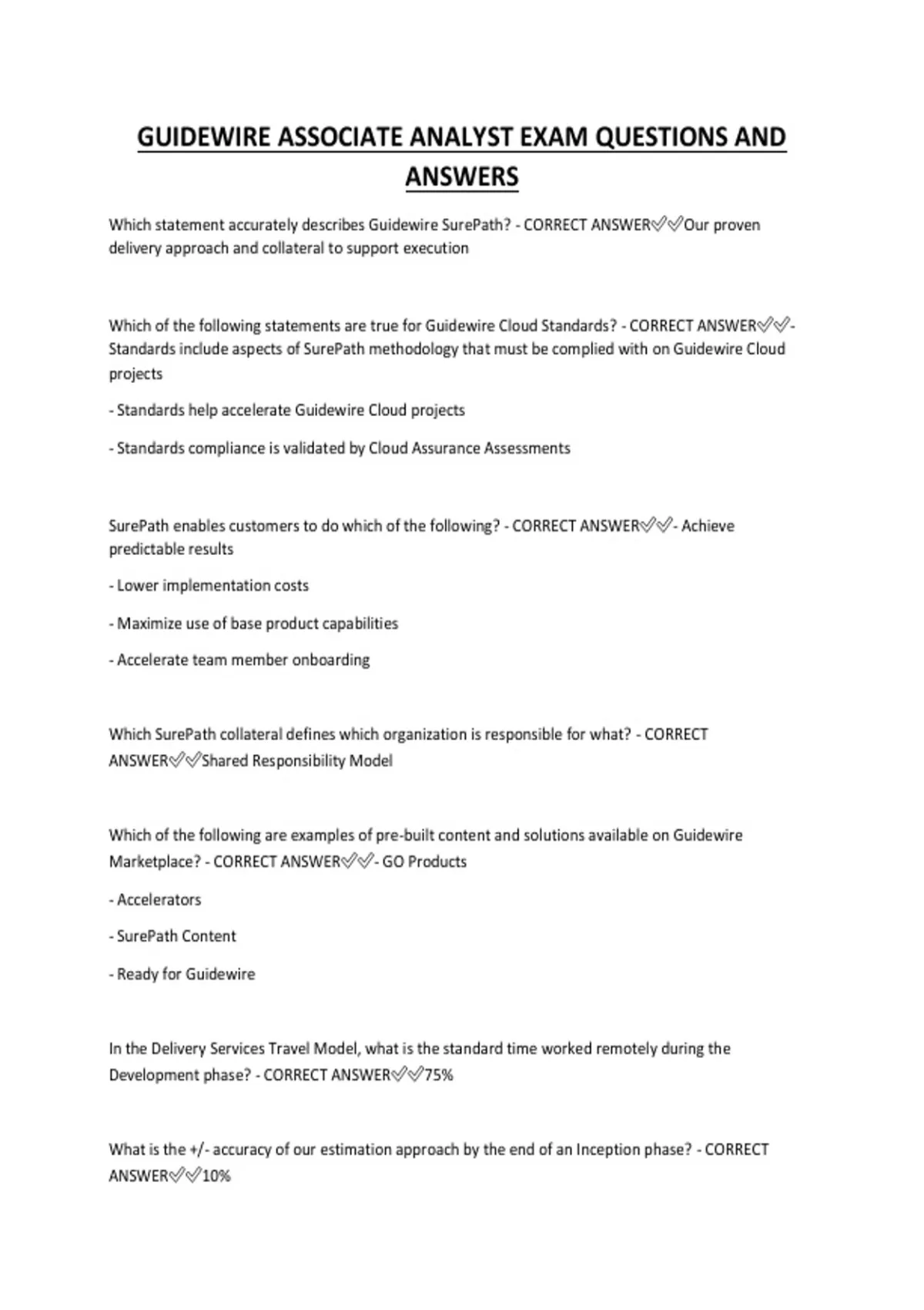 GUIDEWIRE ASSOCIATE ANALYST EXAM QUESTIONS AND ANSWERS Which statement accurately describes Guidewire SurePath? - CORRECT ANSWEROur proven delivery approach and collateral to support execution
