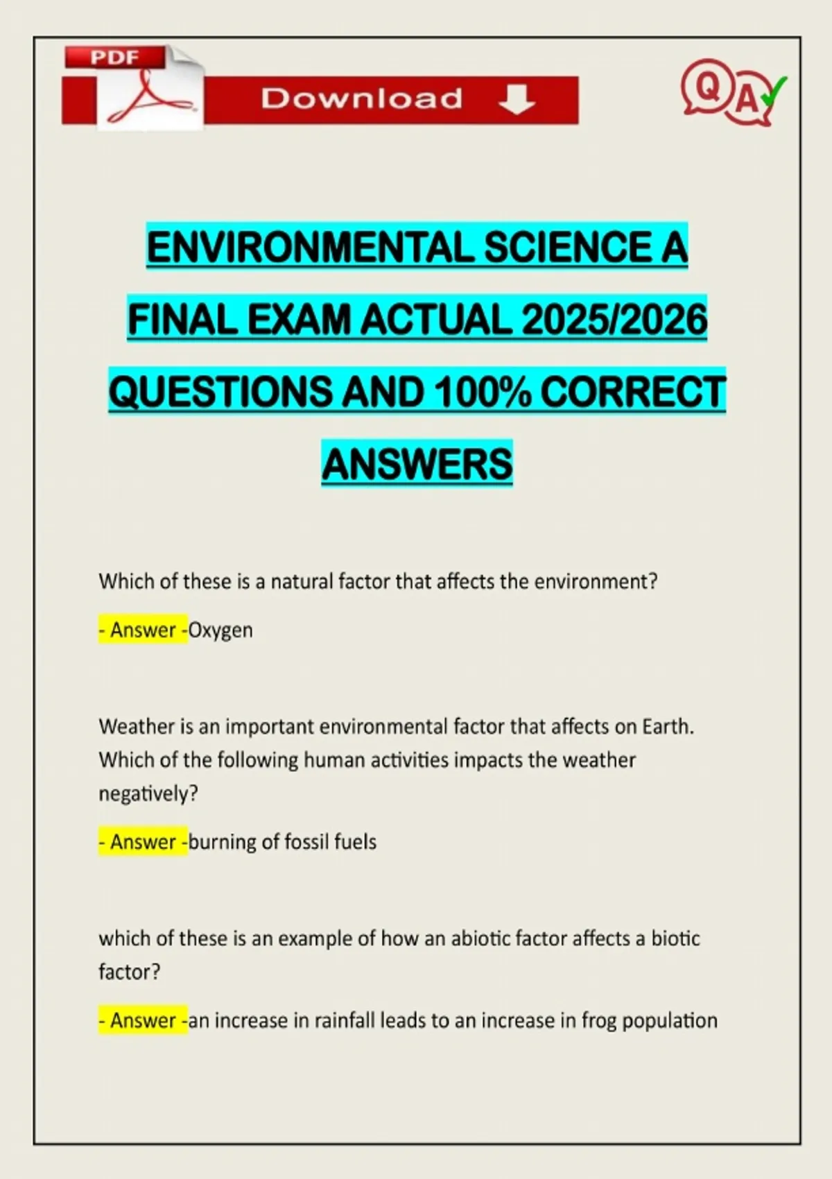 ENVIRONMENTAL SCIENCE A FINAL EXAM ACTUAL 2025/2026 QUESTIONS AND 100% CORRECT ANSWERS Which of these is a natural factor that affects the environment? - Answer -Oxygen Weather is an important environmental factor that affects on Earth. Which of the following human activities impacts the weather negatively? - Answer -burning of fossil fuels which of these is an example of h