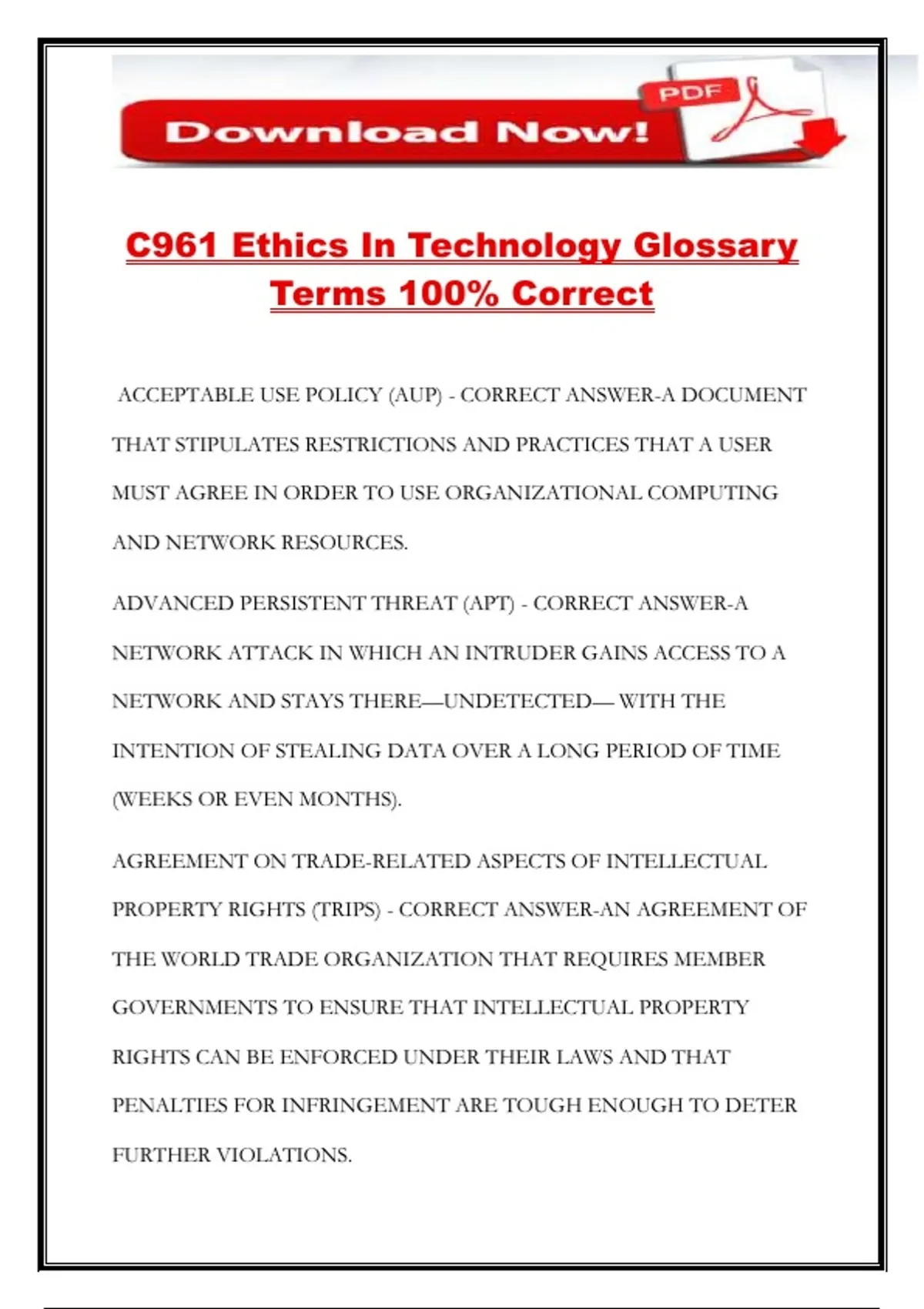 ACCEPTABLE USE POLICY (AUP) - CORRECT ANSWER-A DOCUMENT
