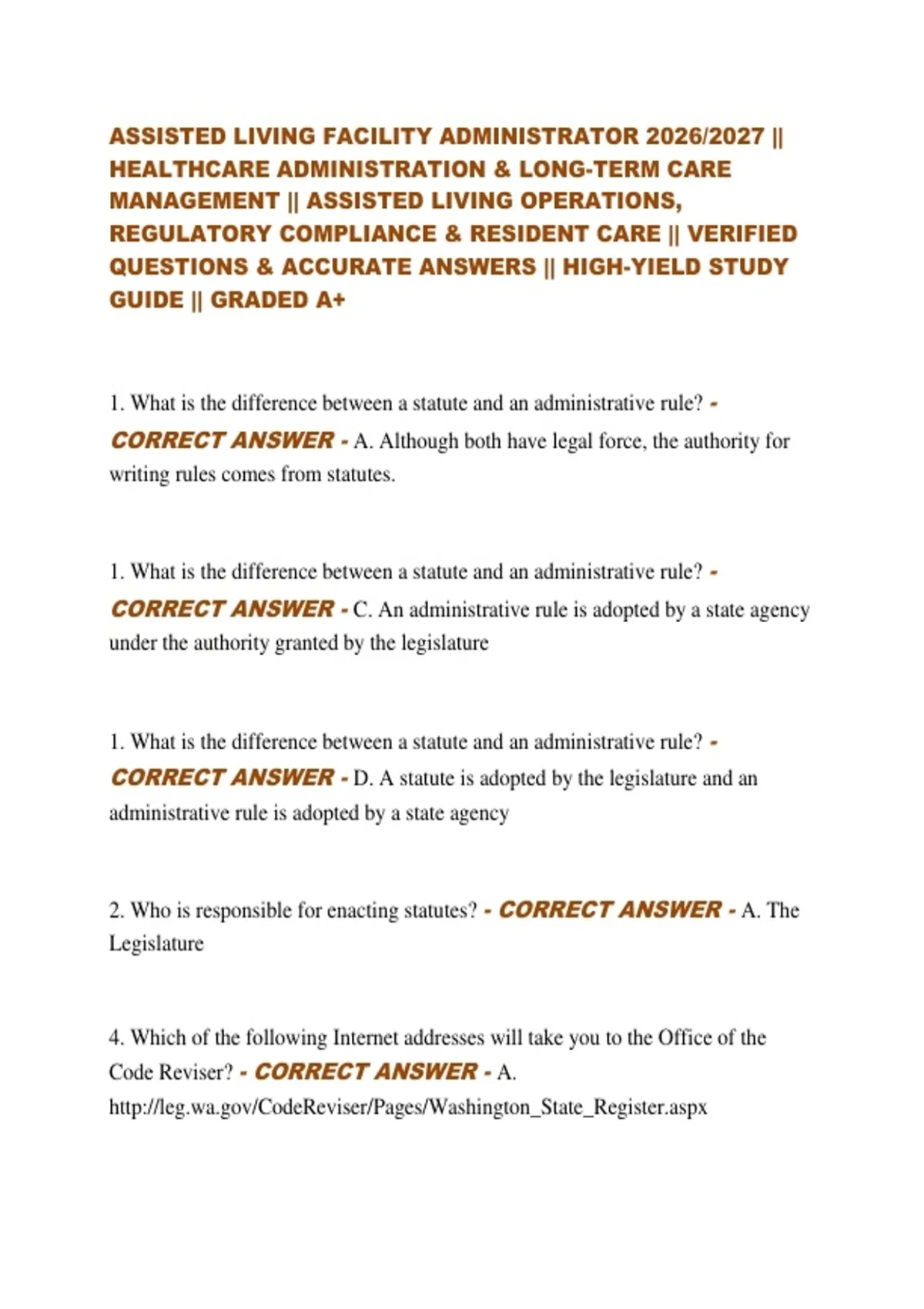 ASSISTED LIVING FACILITY ADMINISTRATOR 2026/2027 || HEALTHCARE ADMINISTRATION & LONG-TERM CARE MANAGEMENT || ASSISTED LIVING OPERATIONS, REGULATORY COMPLIANCE & RESIDENT CARE || VERIFIED QUESTIONS & ACCURATE ANSWERS || HIGH-YIELD STUDY GUIDE || GRADED A+ 1. What is the difference between a statute and an administrative rule? - CORRECT ANSWER - A. Although both have legal force, the authority for writing rules comes from statutes. 1. What is the difference between a statute and an administrative rule? - CORRECT ANSWER - C. An administrative rule is adopted by a state agency under the authority granted by the legislature