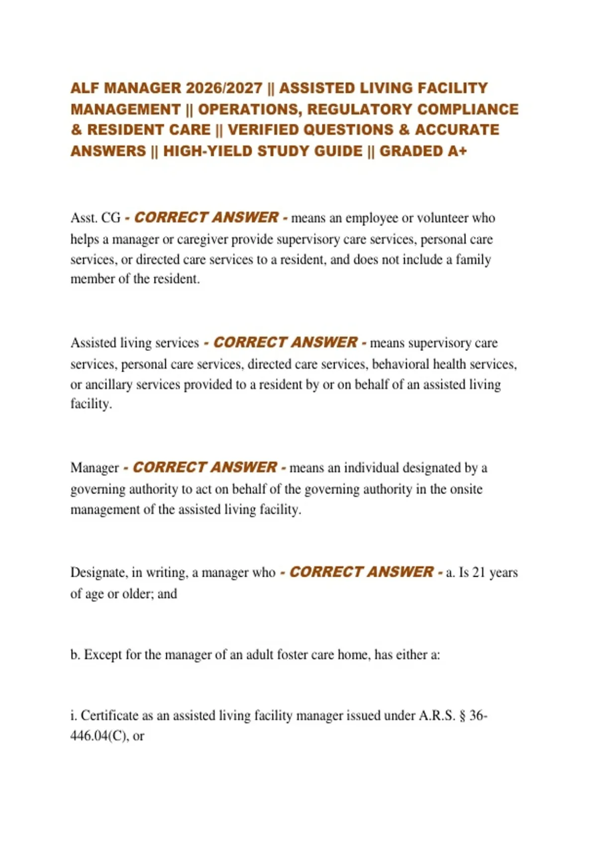 ALF MANAGER 2026/2027 || ASSISTED LIVING FACILITY MANAGEMENT || OPERATIONS, REGULATORY COMPLIANCE & RESIDENT CARE || VERIFIED QUESTIONS & ACCURATE ANSWERS || HIGH-YIELD STUDY GUIDE || GRADED A+