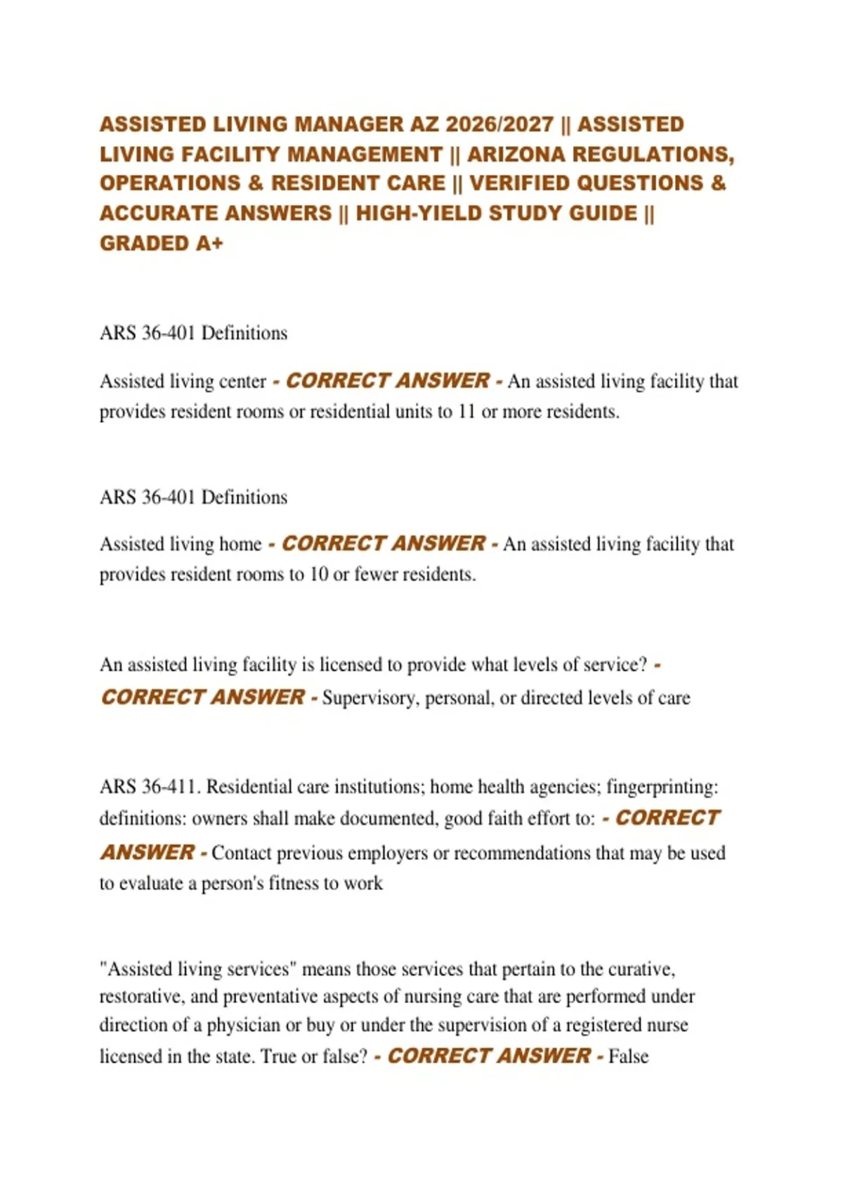 ASSISTED LIVING MANAGER AZ 2026/2027 || ASSISTED LIVING FACILITY MANAGEMENT || ARIZONA REGULATIONS, OPERATIONS & RESIDENT CARE || VERIFIED QUESTIONS & ACCURATE ANSWERS || HIGH-YIELD STUDY GUIDE || GRADED A+
