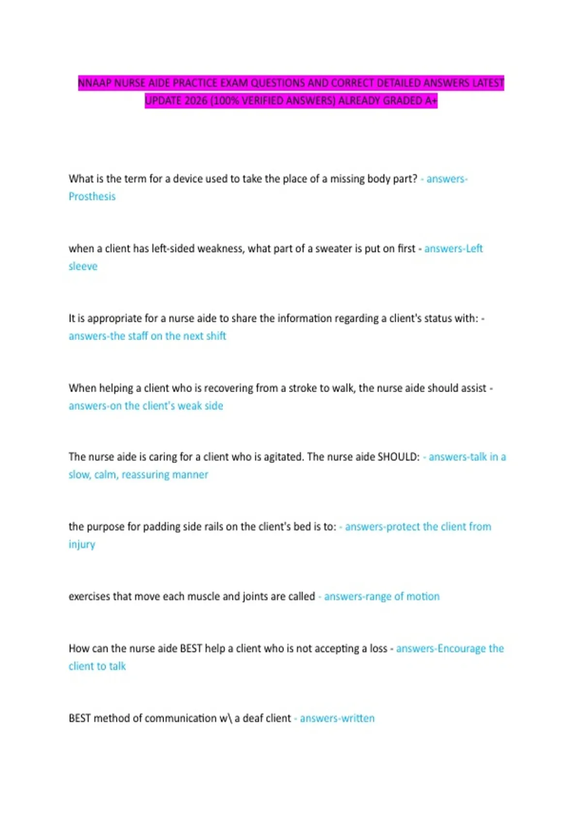 NNAAP NURSE AIDE PRACTICE EXAM QUESTIONS AND CORRECT DETAILED ANSWERS LATEST UPDATE 2026 (100% VERIFIED ANSWERS) ALREADY GRADED A+