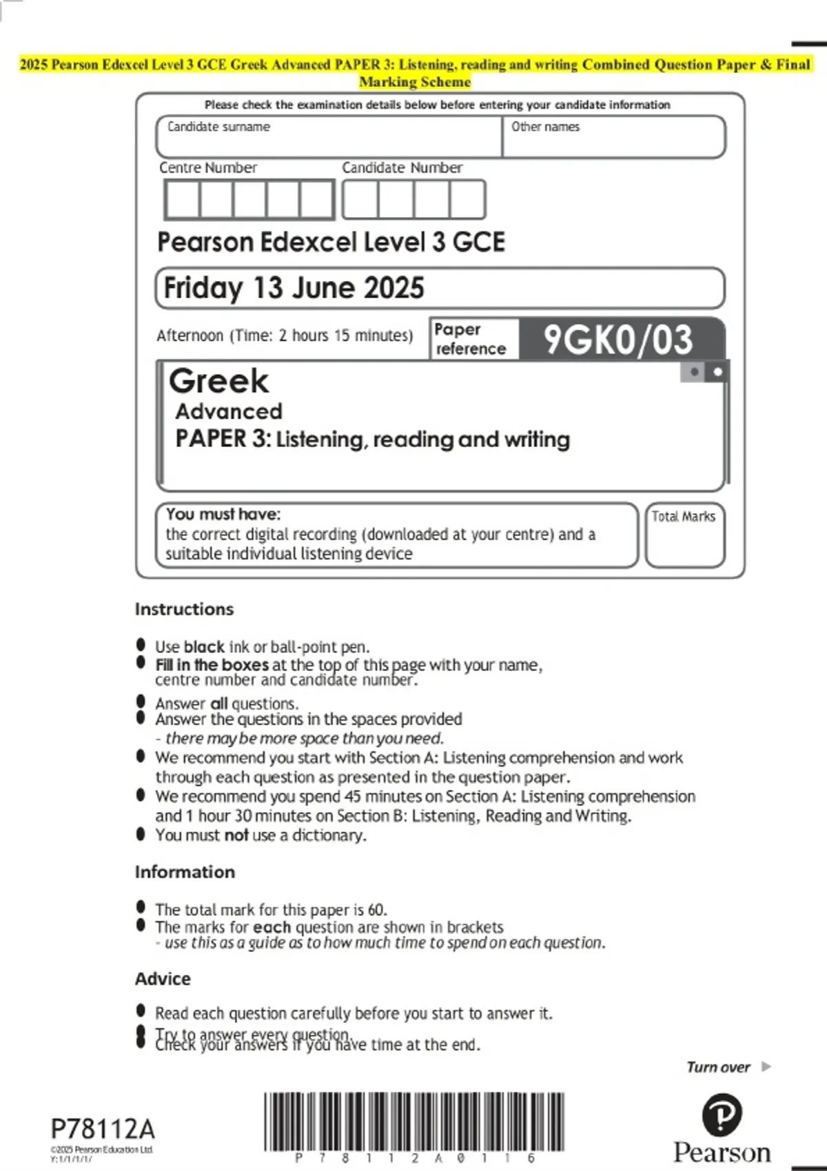 2025 Pearson Edexcel Level 3 GCE Greek Advanced PAPER 3: Listening, reading and writing Examination Paper and Final Marking Scheme