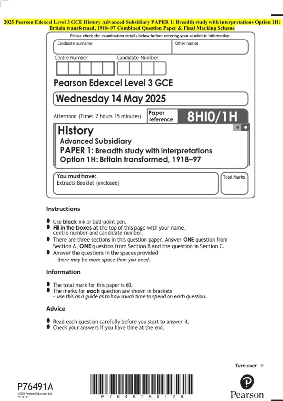 2025 Pearson Edexcel Level 3 GCE History Advanced Subsidiary PAPER 1: Breadth study with interpretations Option 1H: Britain transformed, 1918–97 Examination Paper and Final Marking Scheme