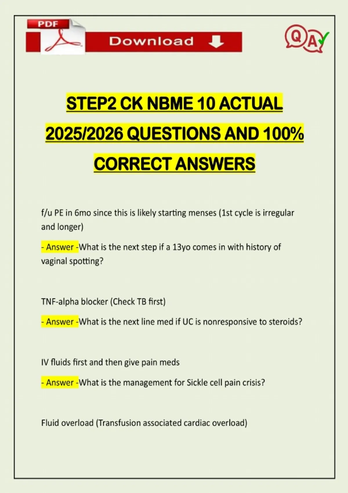 STEP2 CK NBME 10 ACTUAL 2025/2026 QUESTIONS AND 100% CORRECT ANSWERS f/u PE in 6mo since this is likely starting menses (1st cycle is irregular and longer) - Answer -What is the next step if a 13yo comes in with history of vaginal spotting? TNF-alpha blocker (Check TB first) - Answer -What is the next line med if UC is nonresponsive to steroids? IV fluids first and then give pa