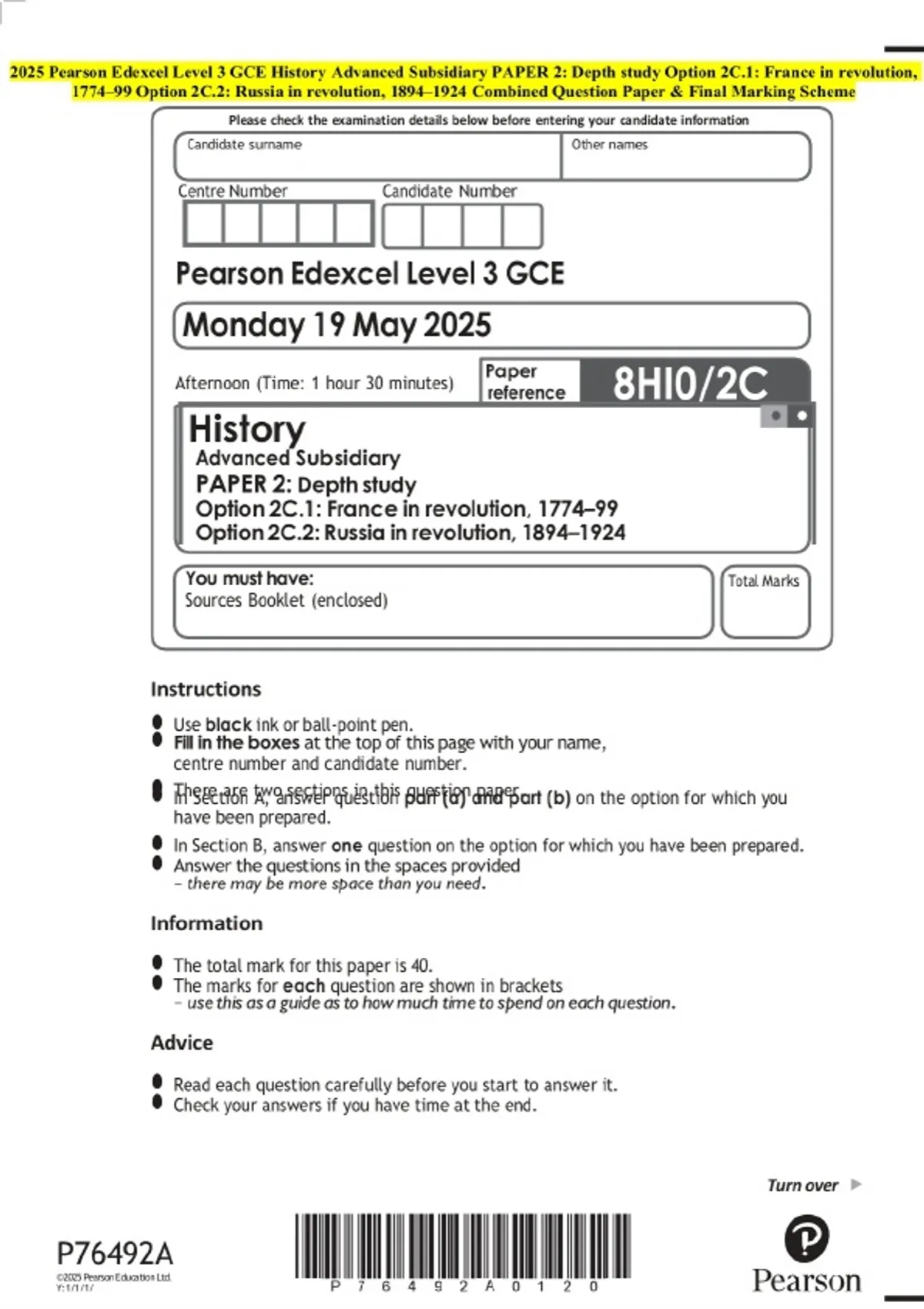 2025 Pearson Edexcel Level 3 GCE History Advanced Subsidiary PAPER 2: Depth study Option 2C.1: France in revolution, 1774–99 Option 2C.2: Russia in revolution, 1894–1924 Examination Paper and Final Marking Scheme