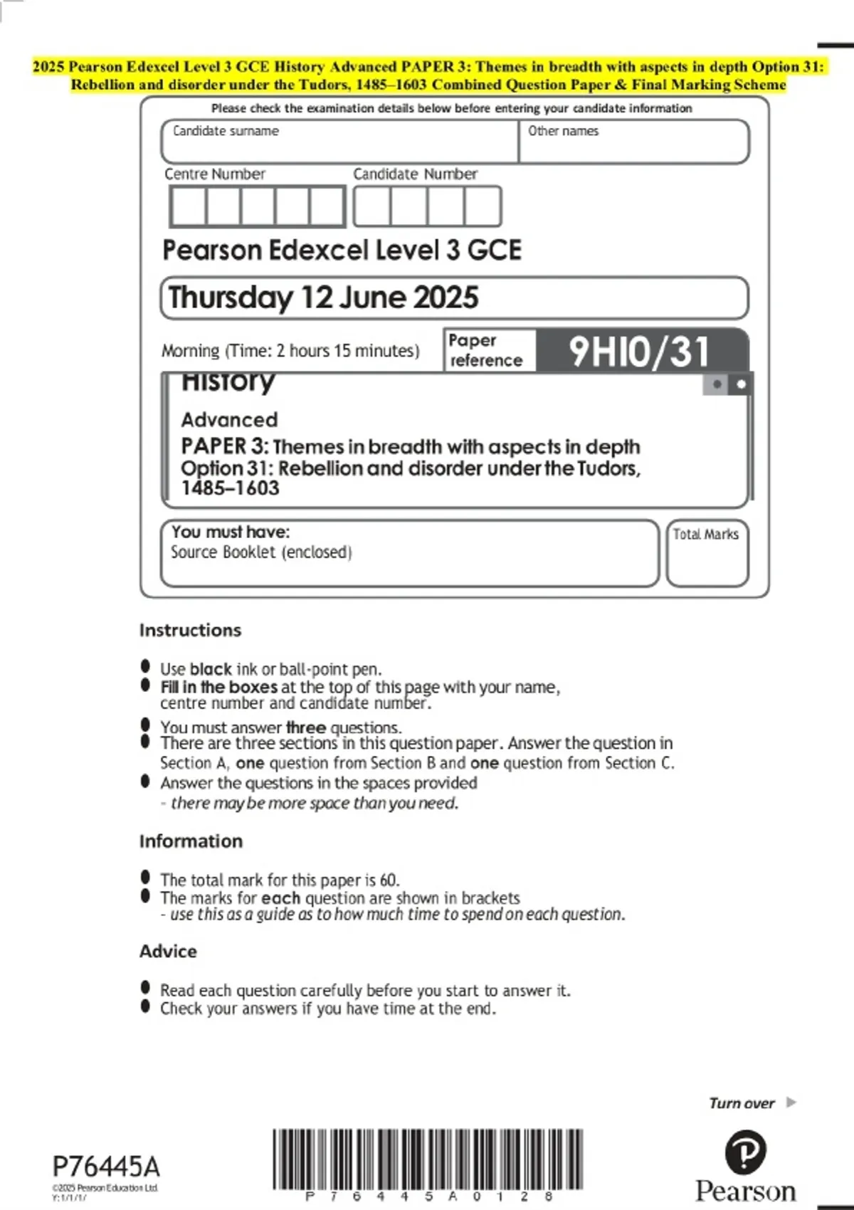 2025 Pearson Edexcel Level 3 GCE History Advanced PAPER 3: Themes in breadth with aspects in depth Option 31: Rebellion and disorder under the Tudors, 1485–1603 Examination Paper and Final Marking Scheme