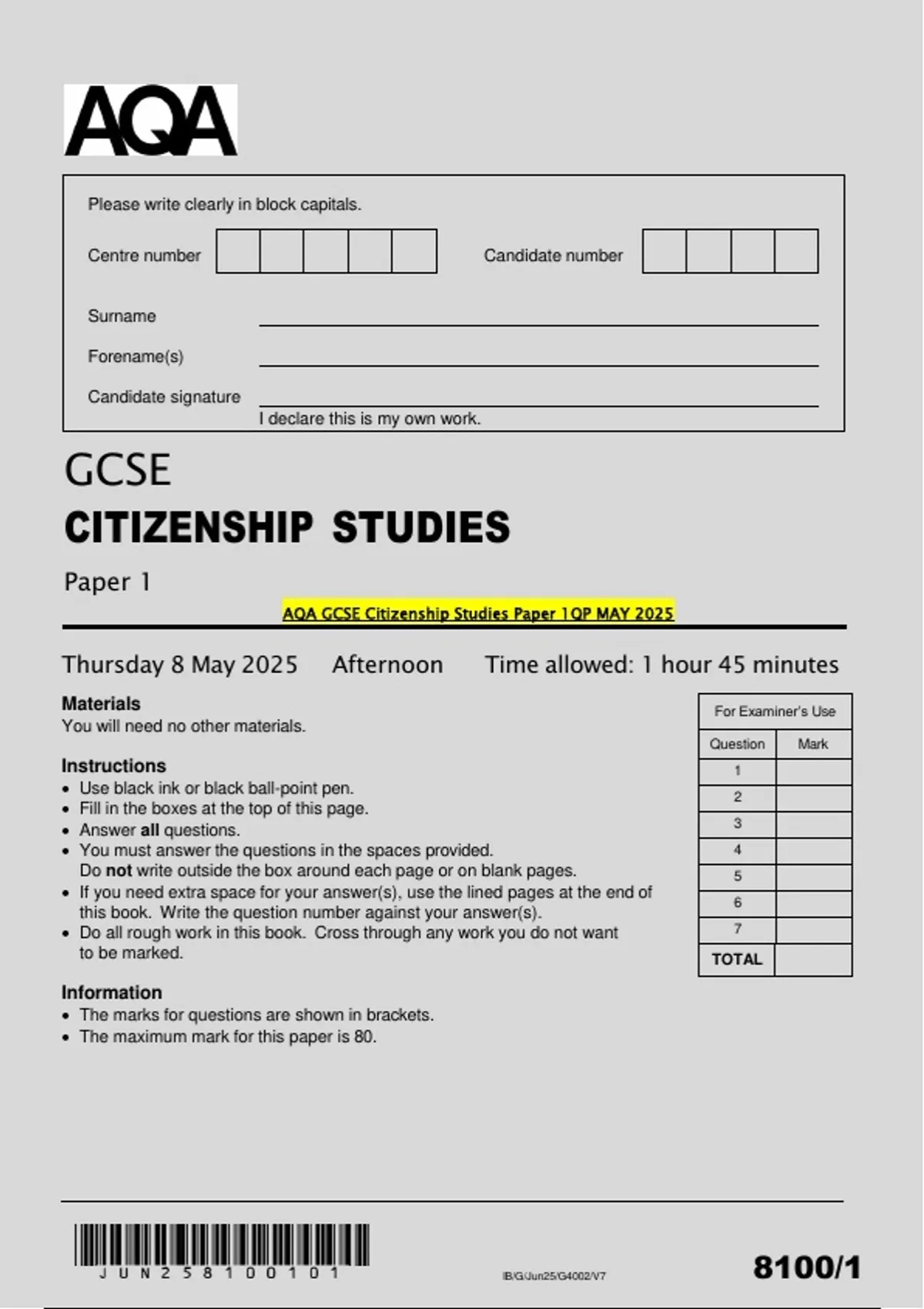 AQA GCSE Citizenship Studies Paper 1QP MAY 2025